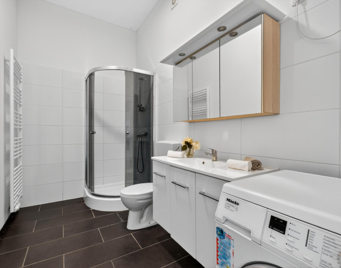 ŠTANDARD: Byt sa predáva v štandarde so zariadenou kuchyňou s chladničkou, umývačkou riadu a sporákom. Kúpeľňa spojená s toaletou je vybavená sprchovým kútom, umyvadlom a prípojkou na pračku.