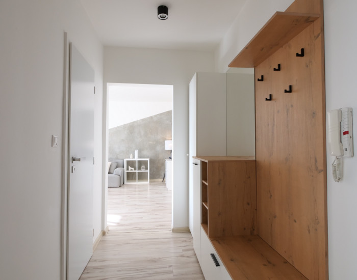 ZARIADENIE: Kompletne zariadený so zabudovanými spotrebičmi, elektrickou varnou doskou, práčkou, manželská posteľ, jedálenský stôl a gauč. V byte je nainštalovaná klimatizácia aj zavedený optický internet. Nájomník má k dispozícii úložný priestor v skrini na chodbe aj v spálni.