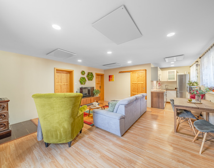Zariadenie: Dom sa predáva so zariadením - toto zahŕňa kuchynskú linku so spotrebičmi, nábytok ako skrine, postele, kuchynský stôl, stoličky, sedacia súprava, policové skrine. Kúrenie je zabezpečené stropnými infrapanelmi.