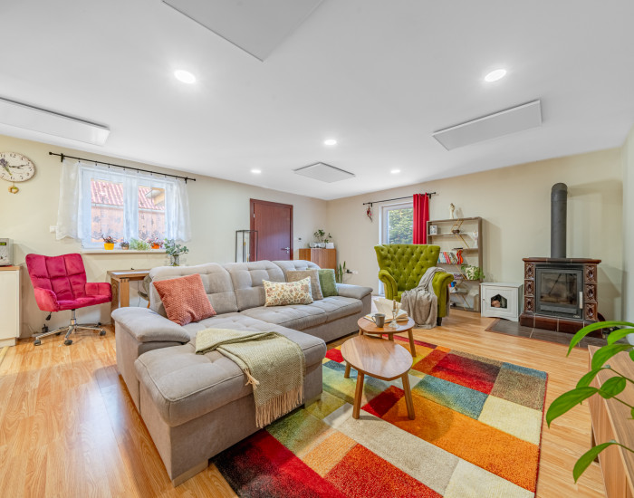 Dispozícia: Dom je veľmi dobre riešený – zo vstupnej chodby sa dostanete do obývacej izby spojenej s kuchyňou. Z obývacej izby sa vchádza do ostatných miestností - toalety oddelenej od kúpeľne so sprchovacím kútom , spálne a študentskej izby. Výstup do záhrady je aj z obývacej izby aj zo splálne. Teplo domova v chladných mesiacoch zabezečí aj pec umiestnená v obývacej miestnosti.