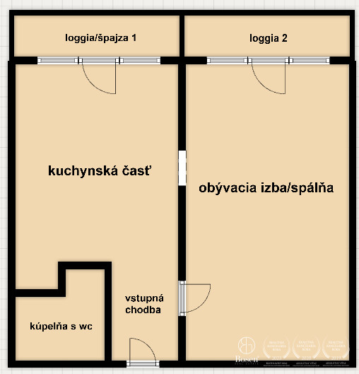 Dispozícia: Pozostáva s vstupnej chodby, spojenej kúpeľne s toaletou, kuchyne a priestrannej spálne s obývacou časťou bytu. Kuchynská časť disponuje uzavretou loggiou, ktorá slúži ako špajza. Vstup do otvorenej loggie sa nachádza v obývacej časti bytu.