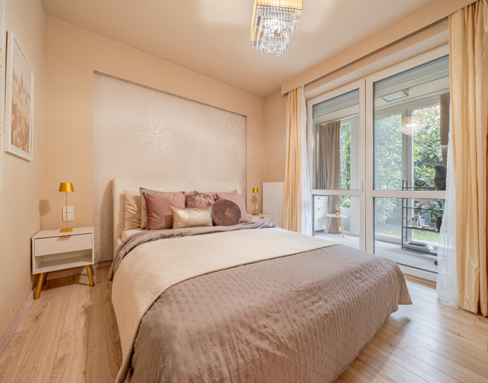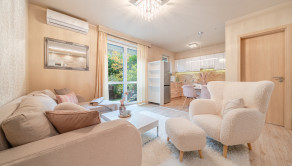 ELRENDEZÉS: A lakás egy 2 szintes, 8 lakásos társasház földszintjén található, zárt udvarban, saját parkolóhellyel. A kertet magas növényzet veszi körül, ami teljes privát hangulatot biztosít – ideális turistáknak vagy business vendégeknek. A lakás klímával felszerelt.