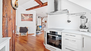 APARTMENT: The layout of the apartment includes two separate bedrooms, an open-plan living area connected to the kitchen, a hallway, a bathroom with a toilet, and a separate walk-in wardrobe. The apartment is located on the second floor in the attic of a residential building. The attic extension was approved in 2008. The apartment features plenty of traditional and skylight windows that provide an exceptional amount of natural light throughout. It is equipped with air conditioning and its own gas heating system. The entrance is secured by a reinforced safety door. Wooden beams are exposed throughout the apartment, enhancing its character.
