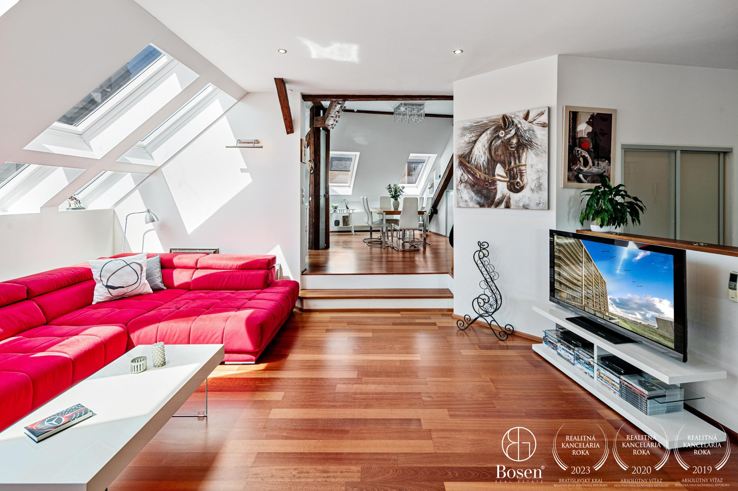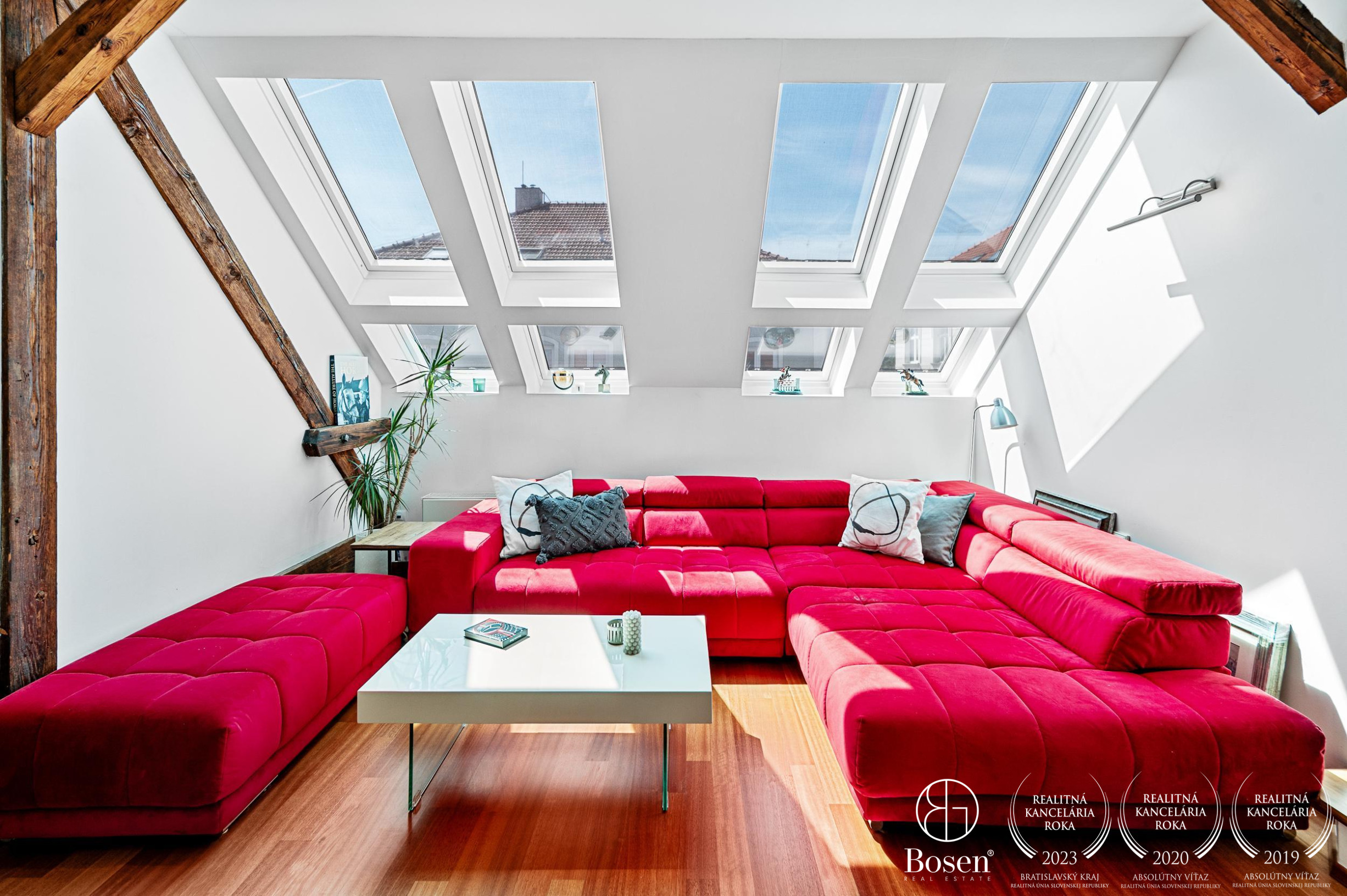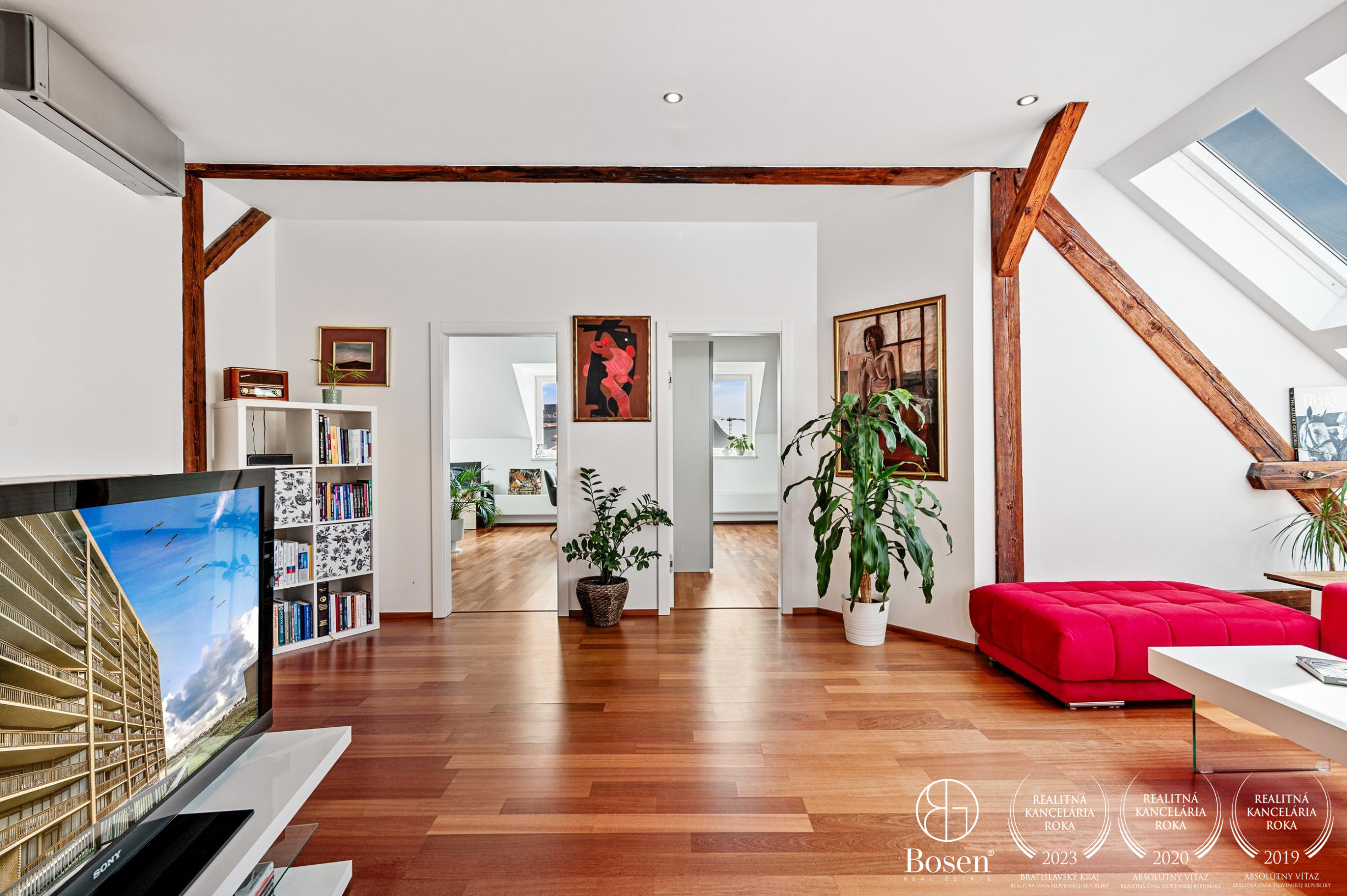 Bosen Group is offering for sale a spacious and bright 3-room apartment with an artistic attic character in a prestigious location—Čajkovského Street, Bratislava 1, Old Town.