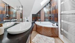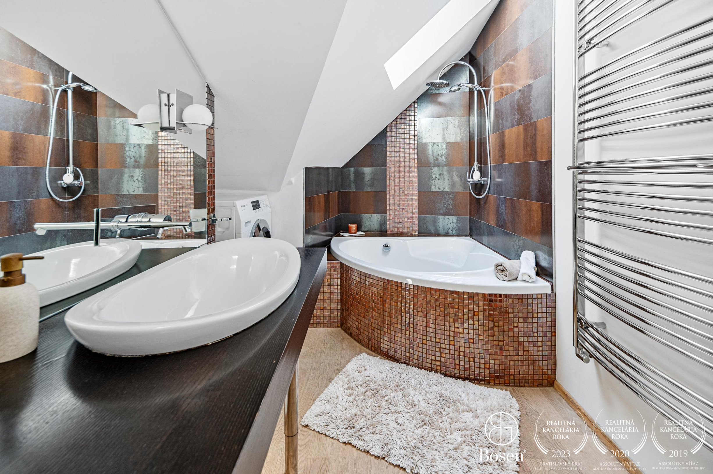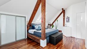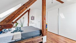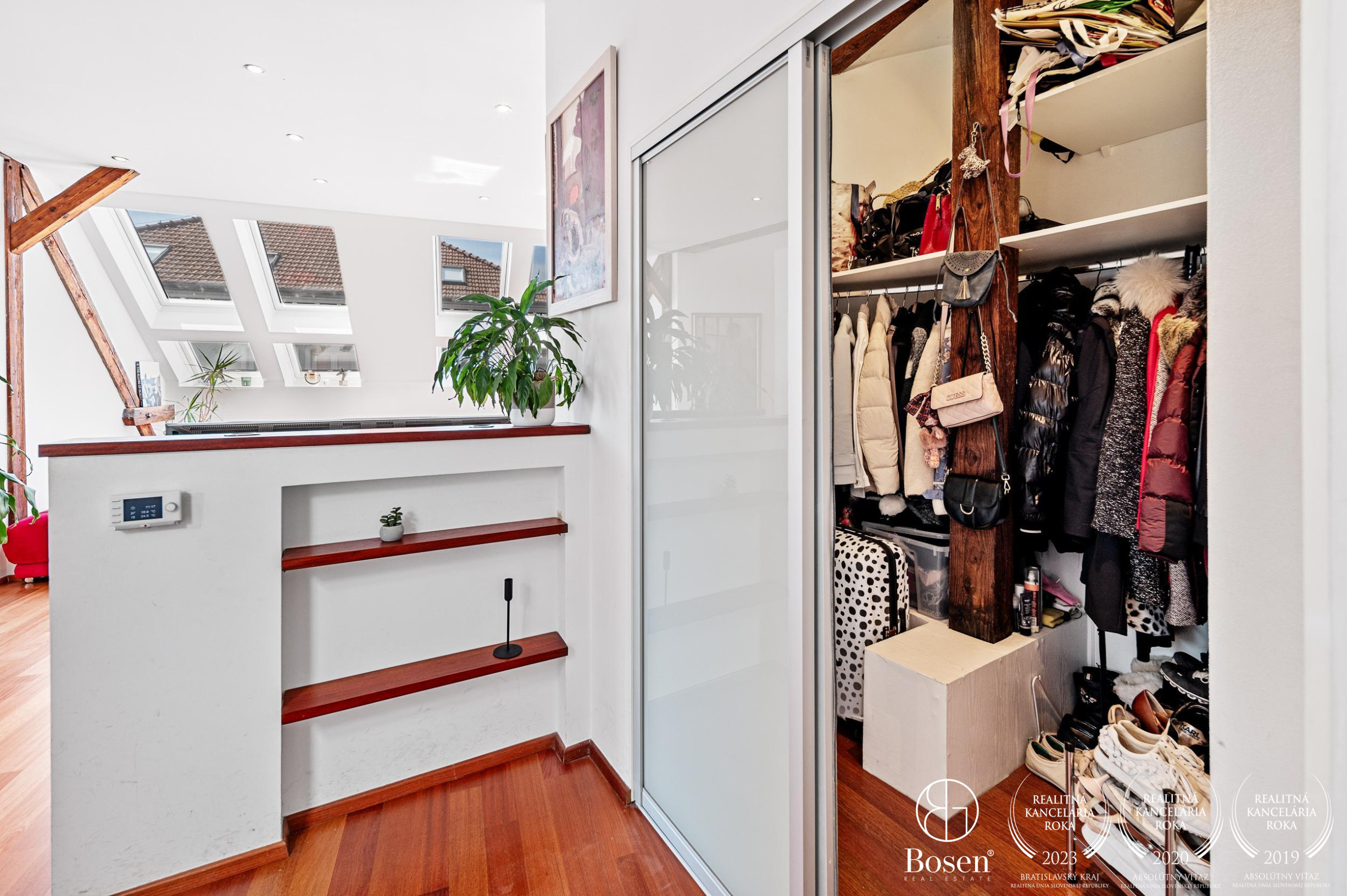 BYT: dispozíciu bytu tvoria dve samostatné spálne, otvorený denný priestor obývačky prepojenej s kuchyňou, chodba, kúpeľňa s WC a samostatný šatník. Byt sa nachádza na druhom poschodí v podkroví bytového domu. Vstavba do podkrovia bola skolaudovaná v roku 2008. V byte nájdeme dostatok klasických aj strešných okien, ktoré zabezpečujú nadštandardný prísun denného svetla v celom byte. Byt disponuje klimatizáciou a má vlastné plynové vykurovanie. Vstup poskytujú bezpečnostné vstupné dvere. Po celom byte sú priznané drevené trámy.
