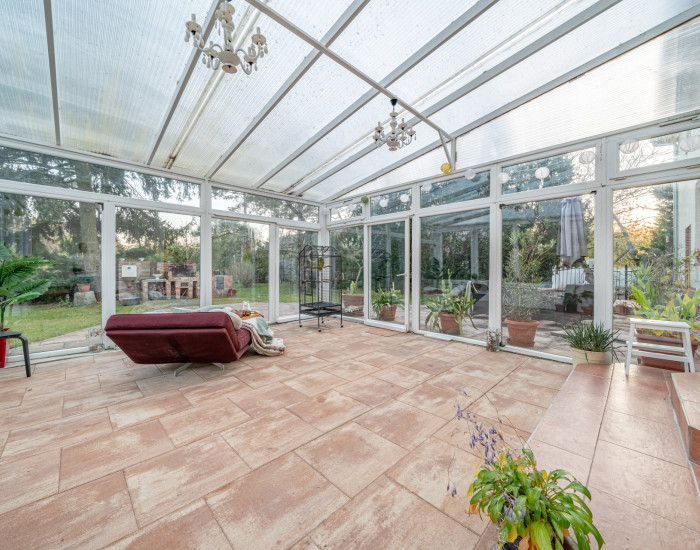 DOM: Rodinný dom s celkovou úžitkovou plochou 474 m² má dve nadzemné podlažia a je postavený z kvalitnej pálenej tehly (hrúbka obvodových múrov 80 cm). Vysoké stropy dodávajú interiéru vzdušnosť a umocňujú dojem jeho veľkorysej rozlohy. Veľké okná zároveň ponúkajú krásne výhľady do záhrady a prirodzené spojenie s okolím, vďaka čomu je interiér presvetlený a harmonicky prepojený s exteriérom.