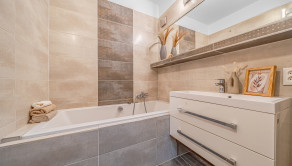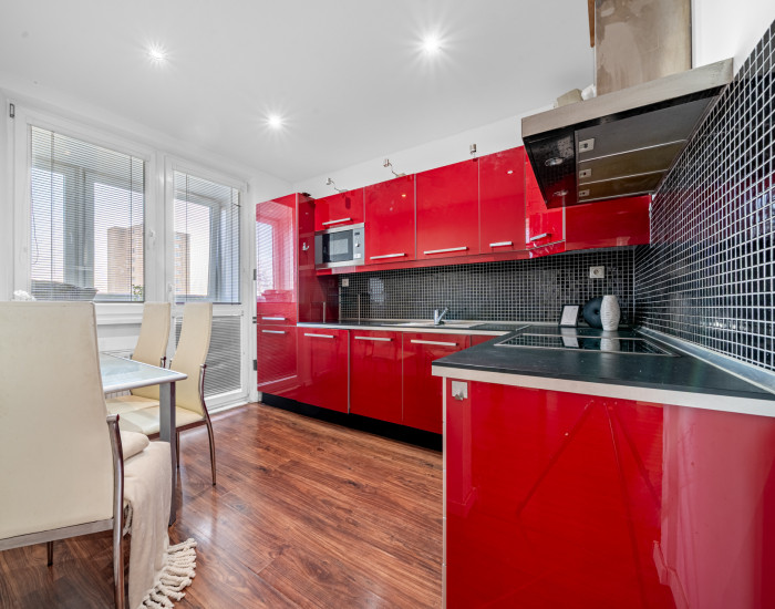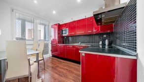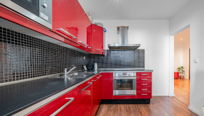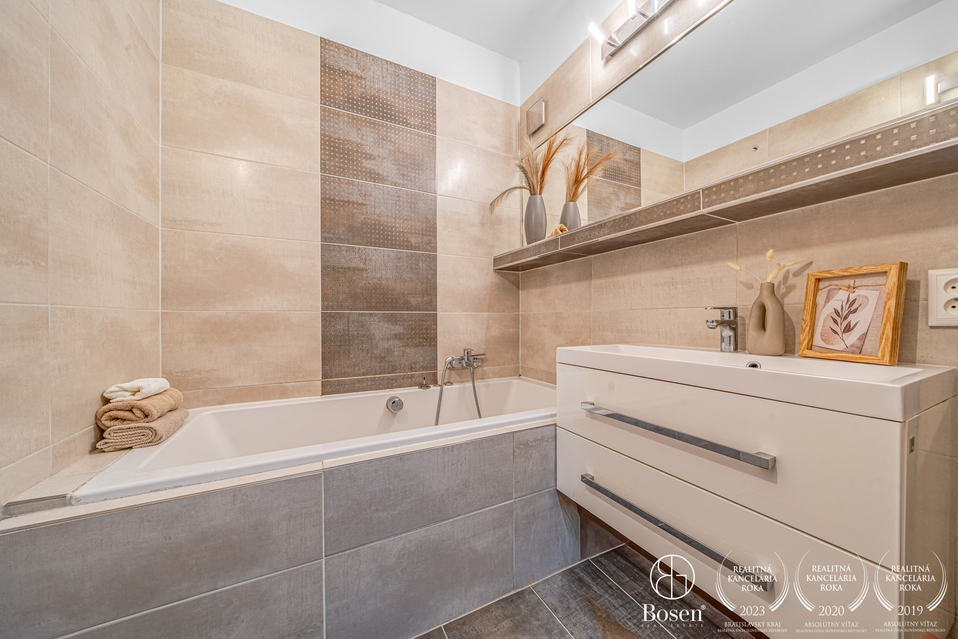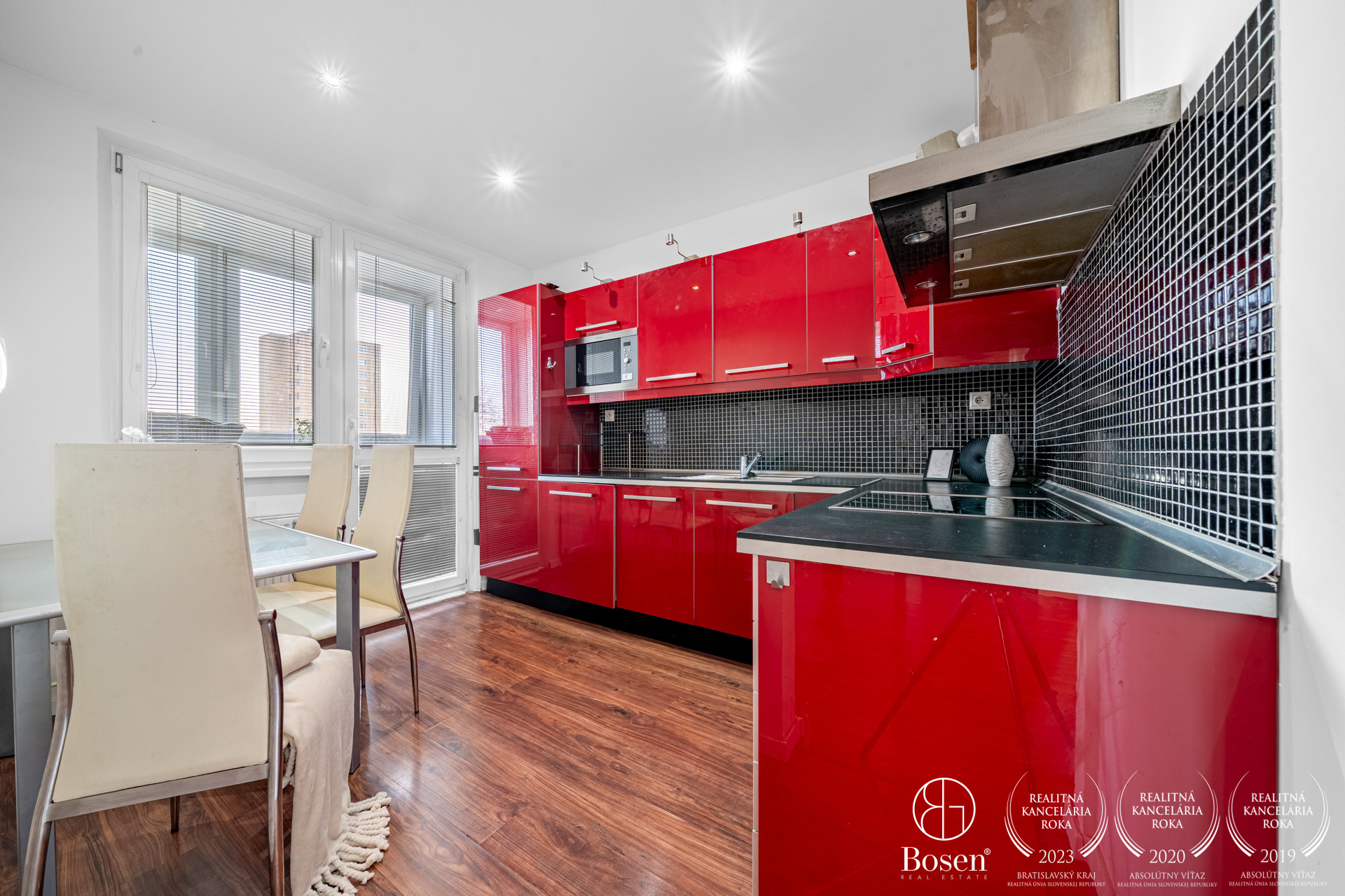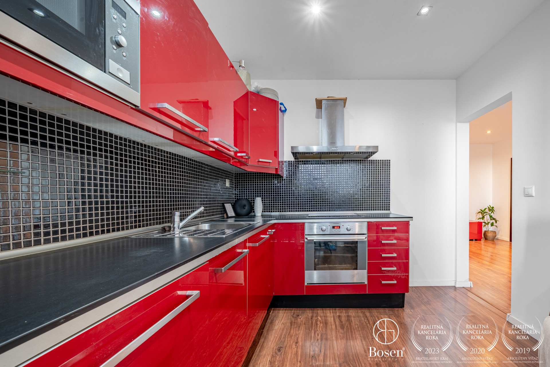 ZARIADENIE: Byt sa predáva kompletne zariadený, ako je zobrazené na inzerovaných fotografiách (bez dekorácií). Kuchynská linka je vybavená všetkými spotrebičmi – sklokeramická varná doska, vstavaná chladnička s mrazničkou, mikrovlnná rúra, elektrická rúra, umývačka riadu, digestor, práčka.