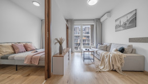 ZARIADENIE: Byt sa prenajíma plne zariadený. Kuchyňa je vybavená modernou kuchynskou linkou so vstavanými spotrebičmi, chladnička s mrazničkou a súčasťou kuchynskej linky je pult so stoličkami. V obývacej časti sa nachádza gauč, obývacia zostava a klimatizácia. Spálňu tvorí manželská posteľ a vstavaný šatník typu rolldor. V kúpeľni je sprchový kút, umývadlo, WC a práčka.