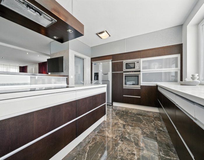 The apartment is located on the top, fifth floor of a residential building with an elevator. The entrance hall offers plenty of storage space and leads into a spacious living room connected to the kitchen and dining area. The kitchen is equipped with appliances and a practical pantry. The living area has direct access to both terraces. The apartment features a master bedroom and two separate rooms, which can be used as children's rooms, an office, or guest rooms. There are two bathrooms – the first is equipped with a bathtub, shower, toilet, and space for a washing machine and dryer; the second bathroom has a shower and toilet. There is also a balcony accessible from the night area. The comfort of living is enhanced by underfloor heating, air conditioning, exterior blinds, and a dominant fireplace that creates a pleasant atmosphere. In 2025, the flooring in the apartment was replaced. The apartment also includes a cellar.