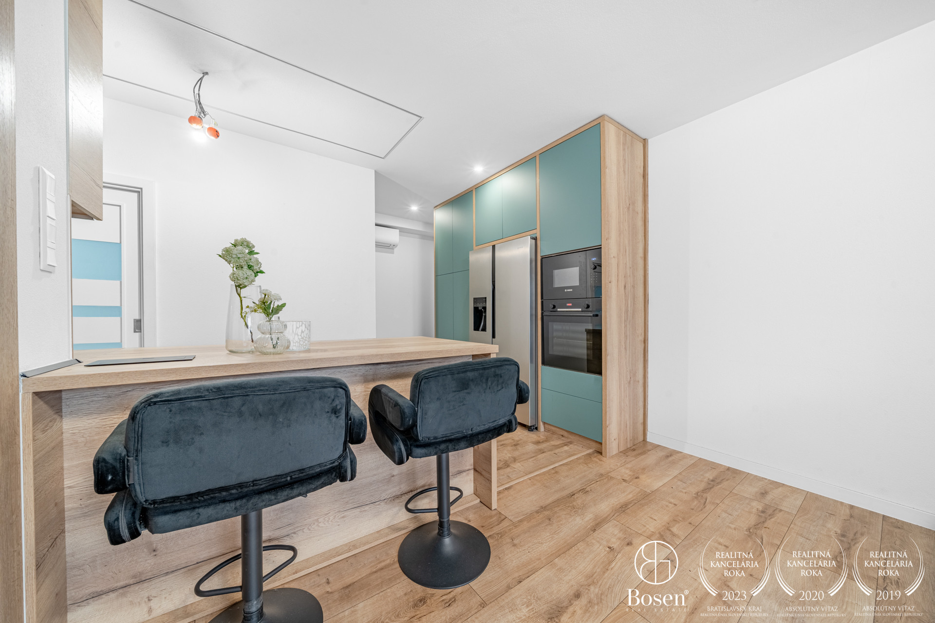 • vstupnej chodby prepojenej s kuchyňou a obývačkou; kuchyňa je vybavená spotrebičmi značky Bosch,