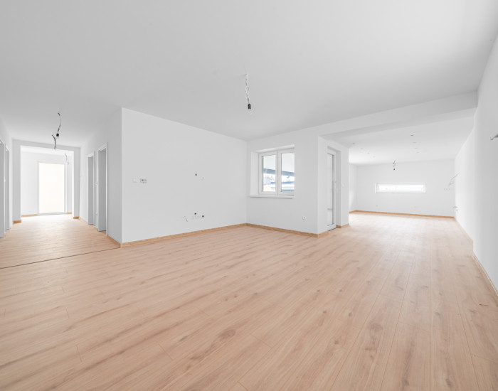 Dennú časť tvorí veľkorysý otvorený priestor kuchyne, jedálne a obývacej izby s priamym výstupom na terasu, čo zabezpečuje plynulé prepojenie interiéru s exteriérom. Nočná časť ponúka tri samostatné izby a dve kúpeľne – hlavná kúpeľňa je priestranná a vybavená sprchovým kútom aj vaňou, zatiaľ čo druhá kúpeľňa je súčasťou rodičovskej spálne, ktorá zároveň disponuje vlastným šatníkom. Súčasťou dispozície je aj technická miestnosť, ktorá poskytuje praktický priestor pre technické vybavenie domu a ďalšie úložné potreby.