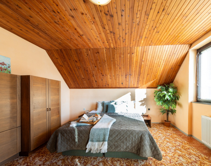 Podkrovie: 3 izby, kúpeľňa, WC, šatník, dva balkóny.