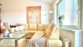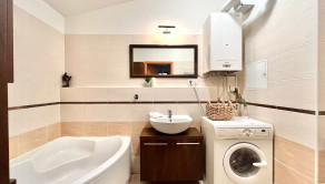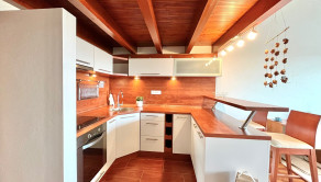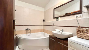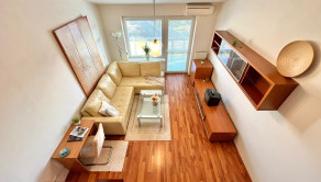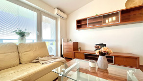 ZARIADENIE: Vo vstupnej chodbe sa nachádza veľká vstavaná rolldoorová skriňa s množstvom úložného priestoru. Kuchyňa je vybavená elektrickou varnou doskou, el. rúrou, chladničkou. Kuchynská časť je zakončená barovým pultom so sedením. V Obývacej časti sa nachádza veľká kožená rozkladacia pohovka s konferenčným stolíkom a obývacia stena. Priestranná kúpeľňa s dostatkom úložného priestoru spojená s WC je vybavená veľkou rohovou vaňou, práčkou. Byt má samostatne regulovateľné kúrenie a ohrev vody plynovým kotlom a klimatizáciu.