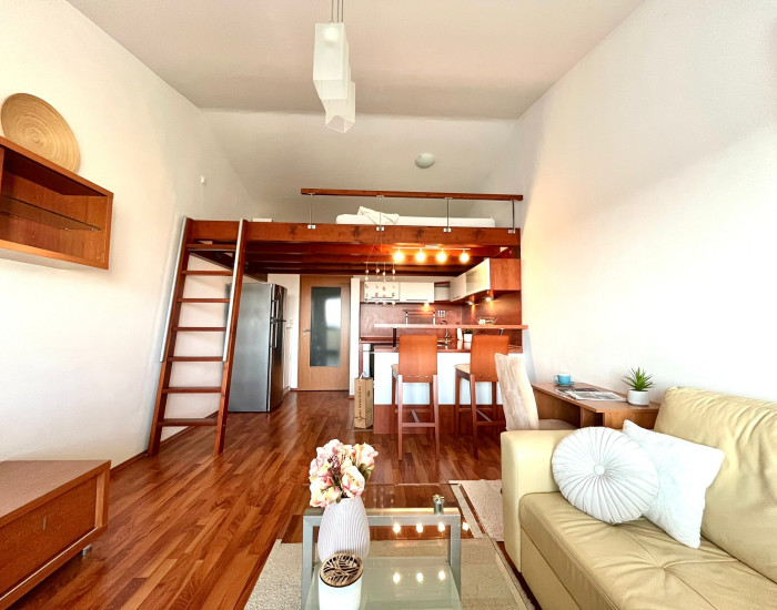 DISPOZÍCIA: Byt je rozdelený na obývaciu zónu, pracovnú zónu, kuchyňu a spaciu časť nad kuchyňou.