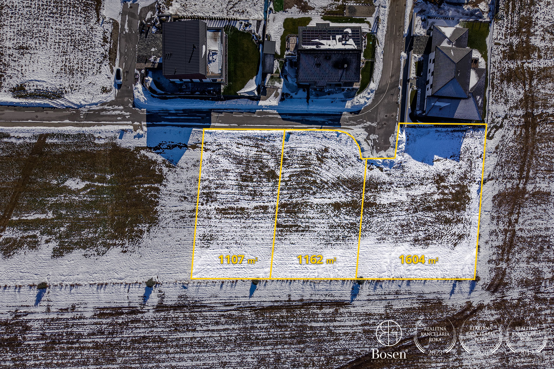 POZEMOKY: Sú o výmere 3 873 m² z toho je jeden najväčší, a to o výmere až 1604 m², druhy je o výmere 1162 m² a tretí pozemok je o výmere 1107 m², slnečné, mierne svahovitého charakteru. Nachádzajú sa v tichej uličke s novou príjazdovou cestou (asfaltová cesta). V lokalite sa nachádza výstavba rodinných domov.