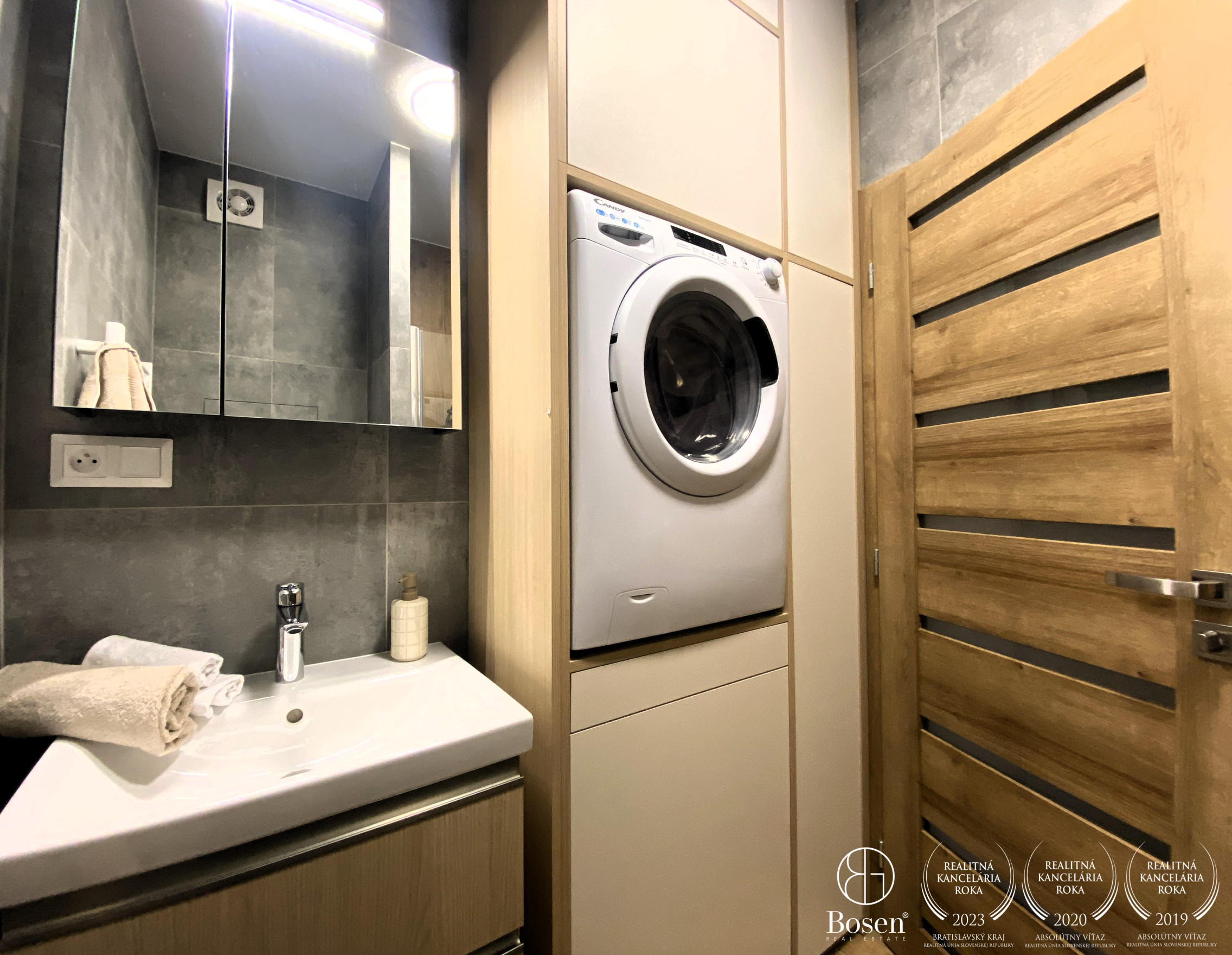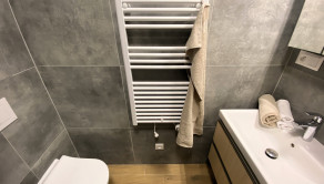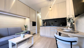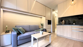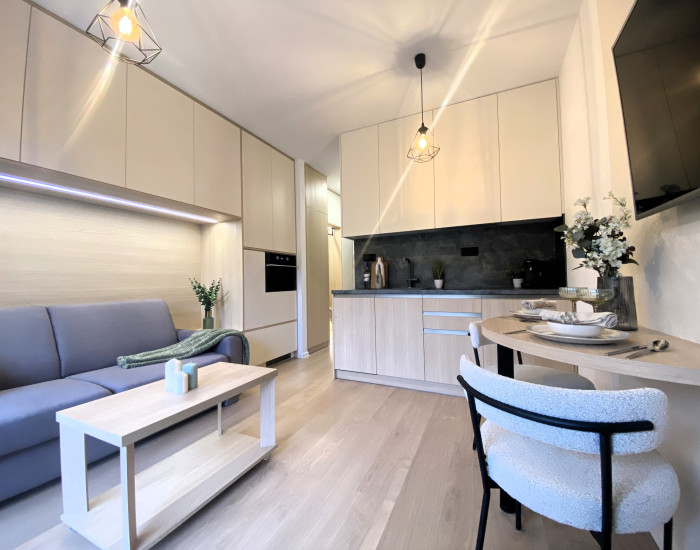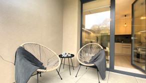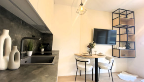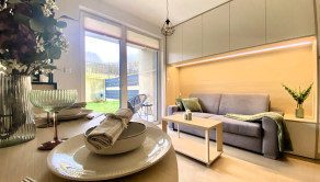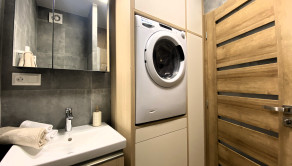 VYBAVENIE: Garsónka je plne zariadená a okamžite pripravená na nasťahovanie. Jej vybavenie zahŕňa: rozkladaciu pohovku, ktorá slúži aj ako pohodlné lôžko, jedálenský stôl so stoličkami, množstvo úložného priestoru v podobe skríň vyrábaných na mieru, práčku a sušičku, sklokeramickú indukčnú varnú dosku, kombinovanú rúru a mikrovlnku, chladničku s mrazničkou, TV, dokonca aj kávovar. V letných mesiacoch je pre nájomníkov k dispozícii aj vonkajšia vírivka, ideálna na relax počas teplých večerov.