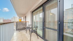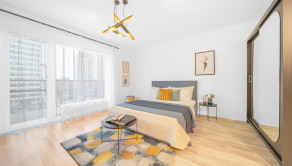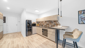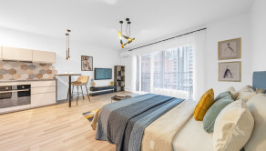 ZARIADENIE: Byt sa predáva kompletne zariadený, vrátane: kuchynskej linky s barovým pultom a vstavanými spotrebičmi (umývačka riadu, elektrická rúra, varná doska), chladničky s mrazničkou, práčky, klimatizácie, dvoch veľkých skríň, policovej skrinky, postele a konferenčného stolíka. Súčasťou interiéru sú laminátové podlahy, kompletná sanita v kúpeľni, obklady a dlažby, bezpečnostné vstupné dvere, videovrátnik, interiérové dvere so zárubňami a plastové okná s izolačným trojsklom a sieťkami proti hmyzu.