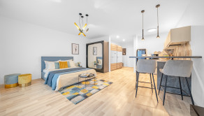 DISPOZÍCIA: Byt pozostáva zo: vstupnej chodby s veľkou šatníkovou skriňou, priestrannej obytnej miestnosti s kuchyňou a s možnosťou oddelenia spacej časti, kúpeľne s vaňou a toaletou, balkóna prístupného z obývacej časti.