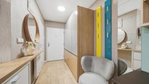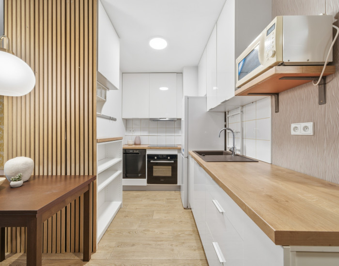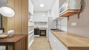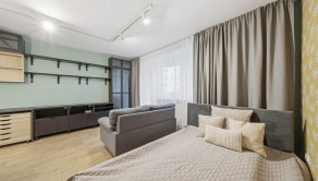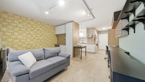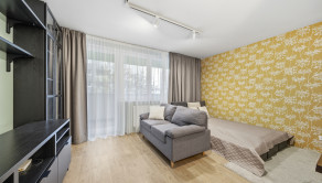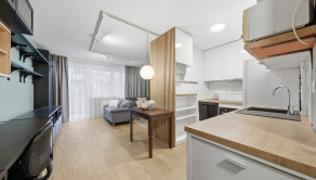 ZARIADENIE: Byt sa prenajíma kompletne ZARIADENÝ. Vo vstupnej chodbe sa nachádza veľká vstavaná skriňa. Byt je rozdelený na kuchynku a izbu, ktoré sú oddelené priečkou. Kuchyňa je vybavená všetkými spotrebičmi (el. varná doska, el. rúra, umývačka, mikrovlnka, chladnička s mrazničkou) a poskytuje aj dostatok odkladacieho priestoru. Pri priečke je stolík s dvomi stoličkami. V izbe sa nachádza posteľ, sedačka a skrinky s poličkami, ktoré poskytujú dostatok úložného miesta. Tiež sa tu nachádza pracovný stôl so stoličkou. Do kúpeľne sa vstupuje z chodby a je vybavená vaňou, umývadlom so skrinkou, toaletou a práčkou. Na balkóne je k dispozícii aj sedenie.