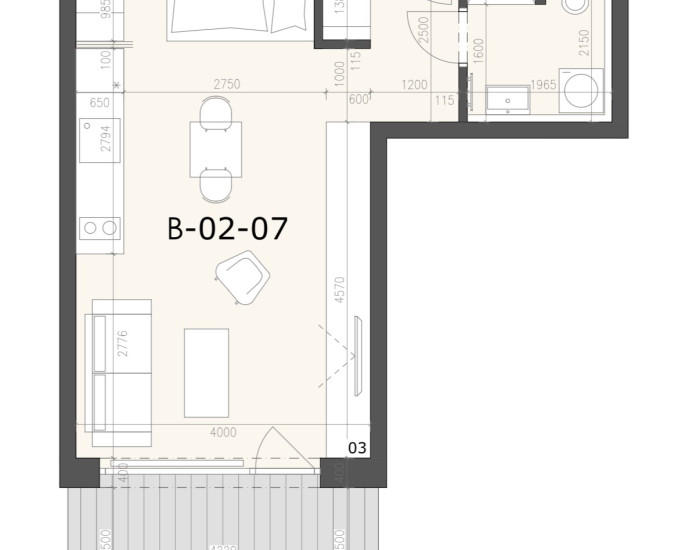 - predsieň s priestorom na šatníkovú skriňu, kúpeľňa so sprchovým kútom a WC, izba s východom na loggiu