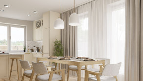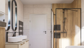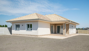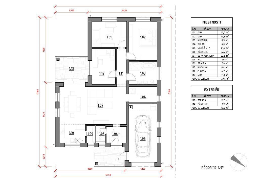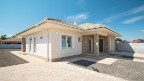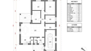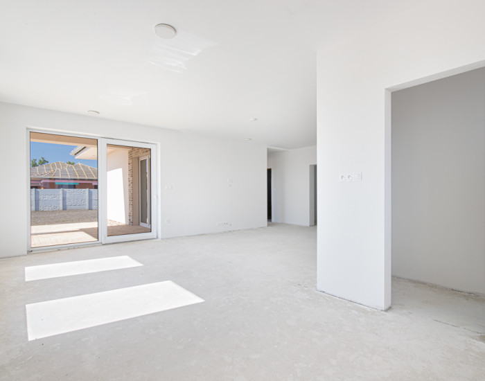 DISPOZÍCIA: Vstup do domu alebo do garáže je cez kryté závetrie. Cez bezpečnostné dvere sa dostanete do predsiene, z ktorej sa dostanete do obývacej izby, ktorá má spolu s kuchyňou vyše 40m2 k tomu prislúcha ešte špajza. Jednoduché ale výborné riešenie oddeľuje dennú časť od nočnej. Z dlhej chodby sa otvárajú dvere do technickej miestnosti (vhodná aj ako práčovňa) a priestrannej kúpeľne so sprchovacím kútom, vaňou, dvojumývadlom a WC (mimochodom samostatné WC je aj pri vstupe do domu). Z tejto chodby sa dostanete aj do 3 spální, z ktorých prvá má východ na terasu. Na 11m2 terasu sa samozrejme dostanete aj z obývacej miestnosti.