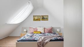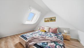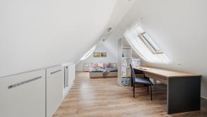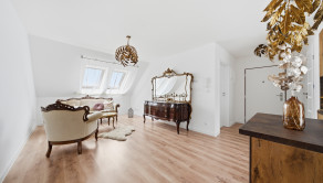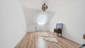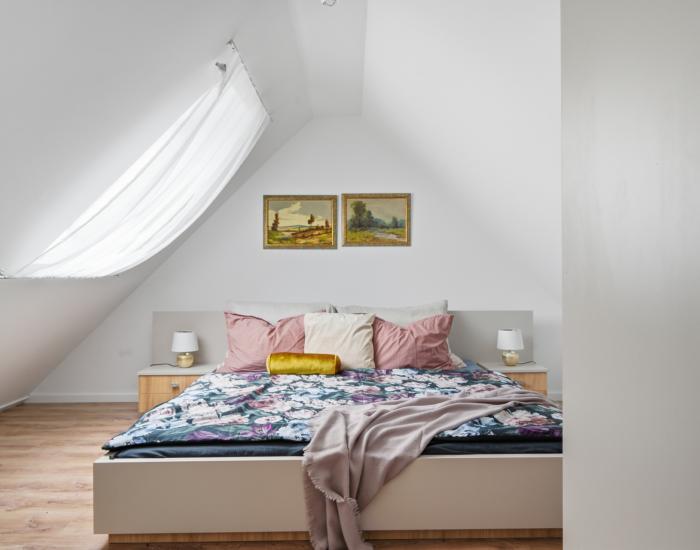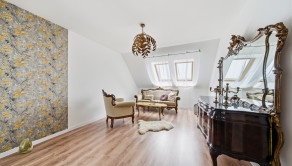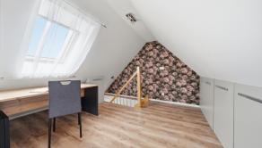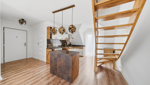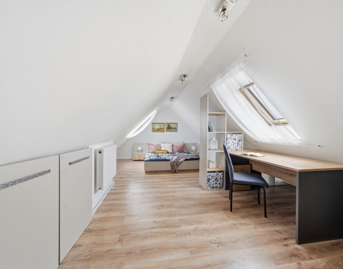 DISPOZÍCIA: V prvom podlaží bytu sa nachádza vstupná chodba, samostatná izba, priestranná obývacia izba prepojená s kuchyňou s východom na balkón a kúpeľňa s vaňou a toaletou. Na poschodí je veľká spálňa s dostatkom priestoru na pracovňu.