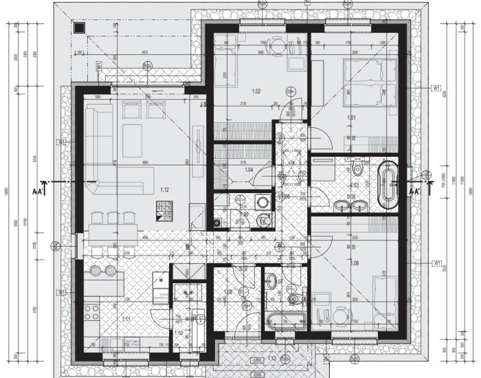 DISPOZÍCIA: Dom je prízemný typu bungalov, hliníkové vstupné dvere do vstupnej chodby s úložným priestorom, priestranná kúpeľňa s vaňou,sprchovým kútom s dvojumývadlom a toaletou, technická miestnosť (s priestorom pre tepelné čerpadlo, práčku, sušičku a úložným priestorom), samostatný šatník, kúpelňa so sprchou, umývadlom a WC. Priestranná obývačka s krbom, kuchyňou a jedálenskou časťou, samostatná špajza, veľká spálňa, dve samostatné izby s priestorom na vstavaný šatník (rolldoor), prestrešená priestranná terasa. Podkrovie môžete využiť ako úložný priestor.