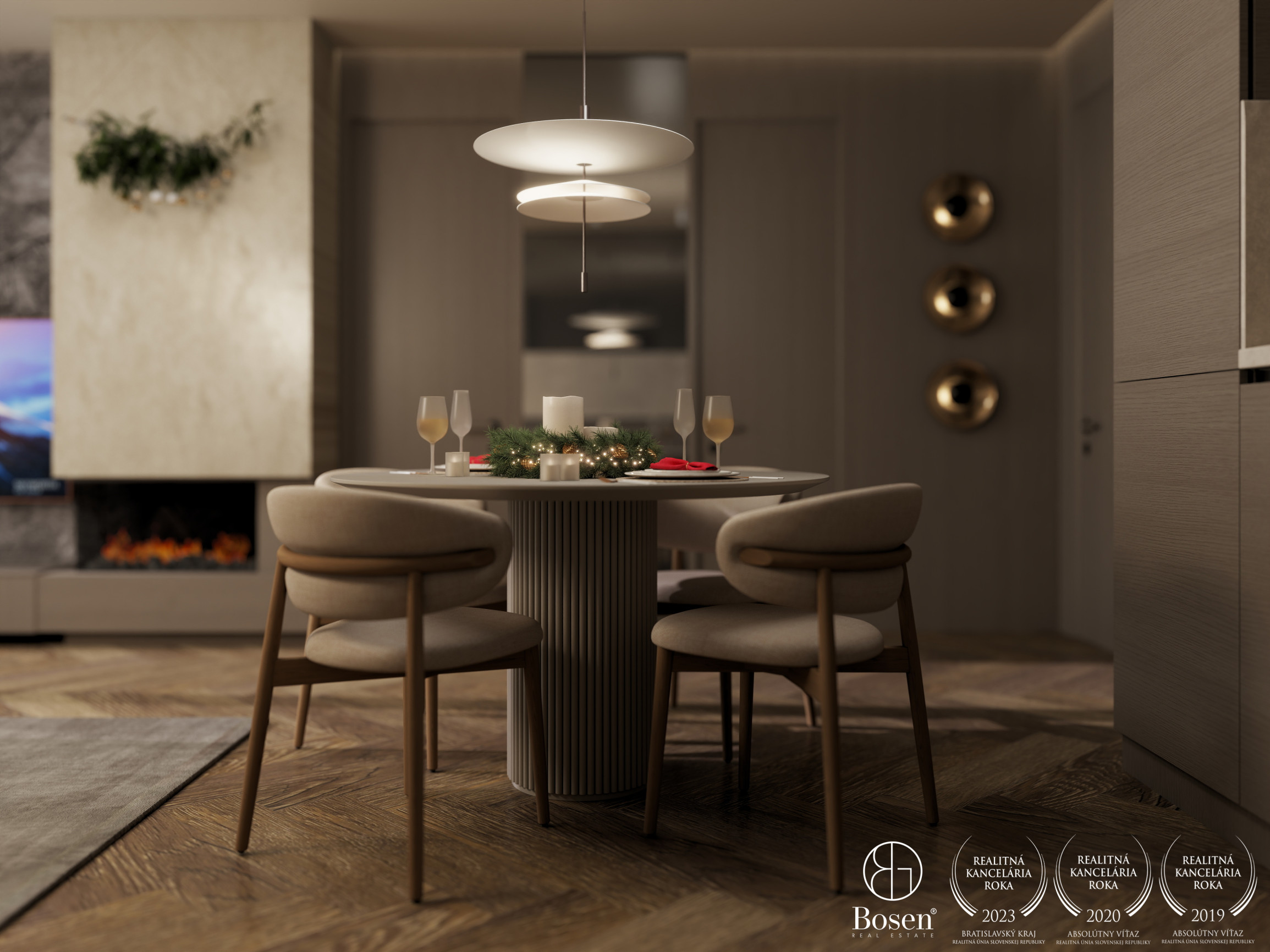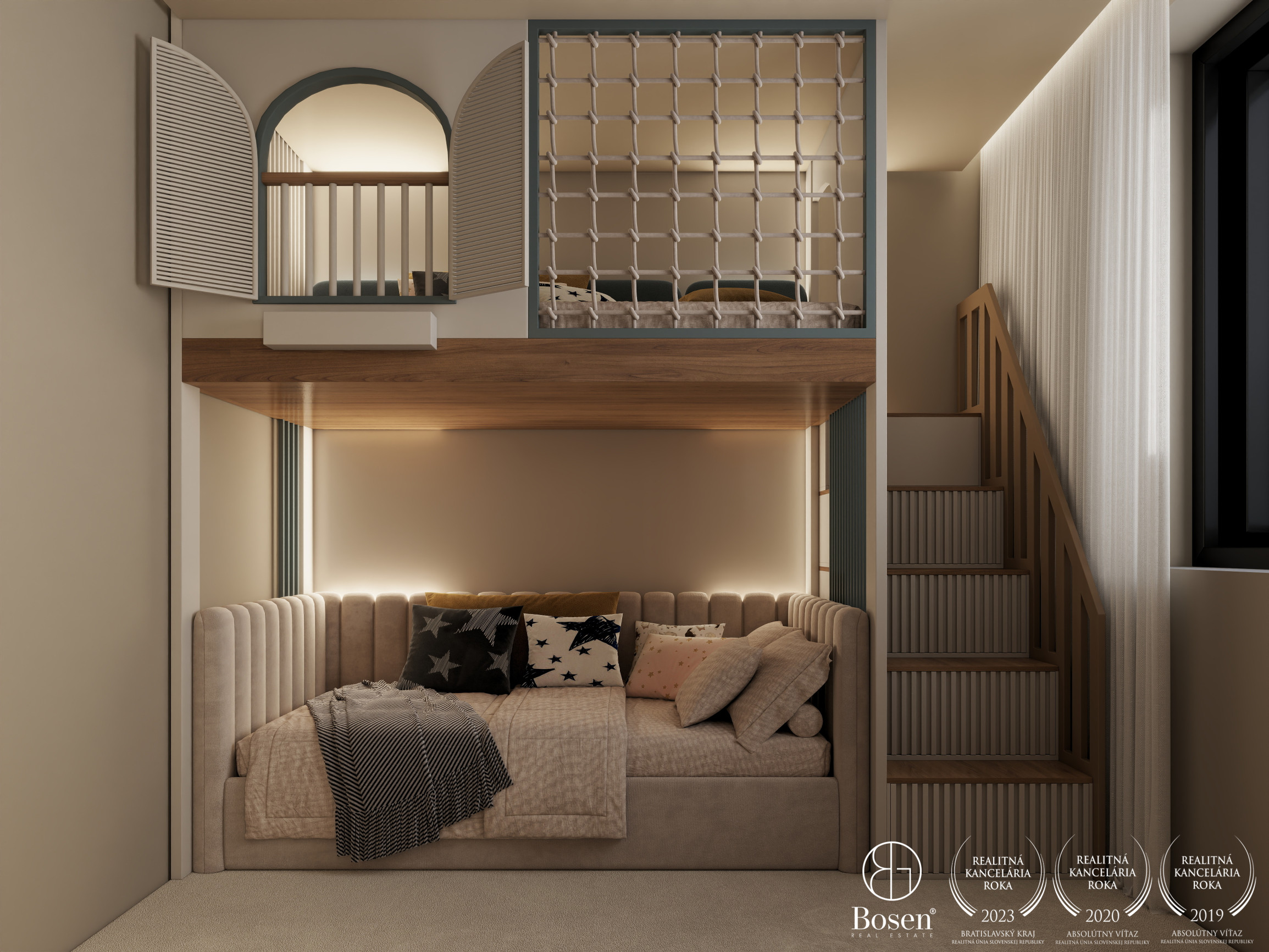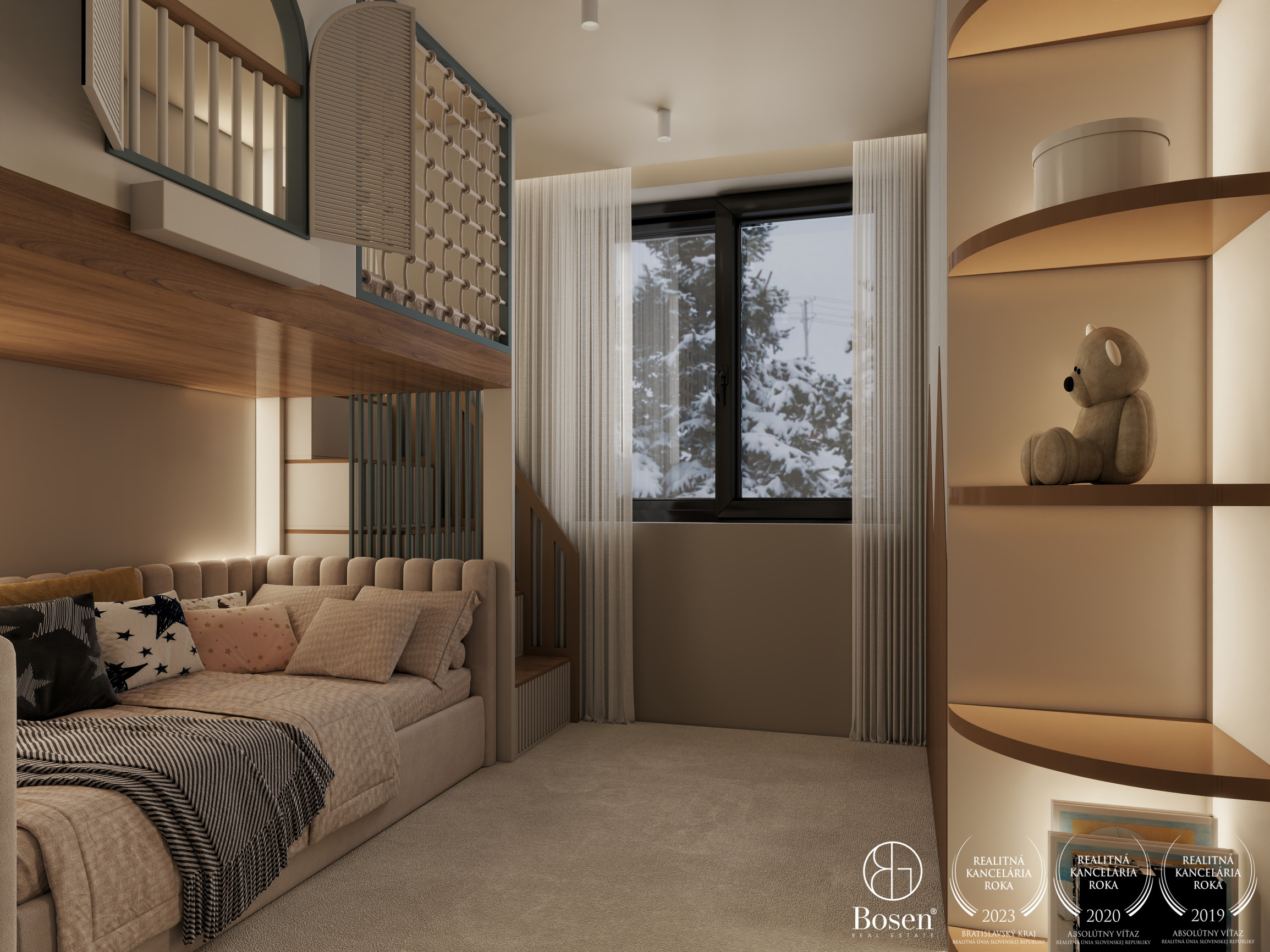 DISPOZÍCIA: Apartmán má praktickú a vzdušnú dispozíciu: vstupná chodba so schodiskom, kúpeľňa s toaletou, priestranná obývacia izba prepojená s kuchyňou a jedálenskou časťou s výstupom na terasu, spálňa a samostatná izba (detská izba).