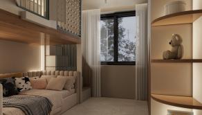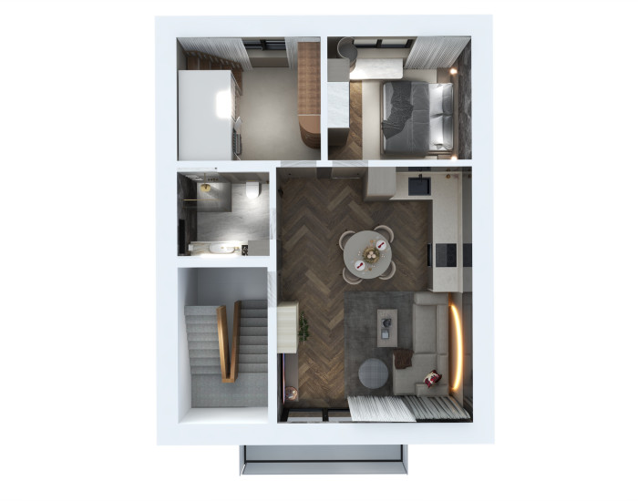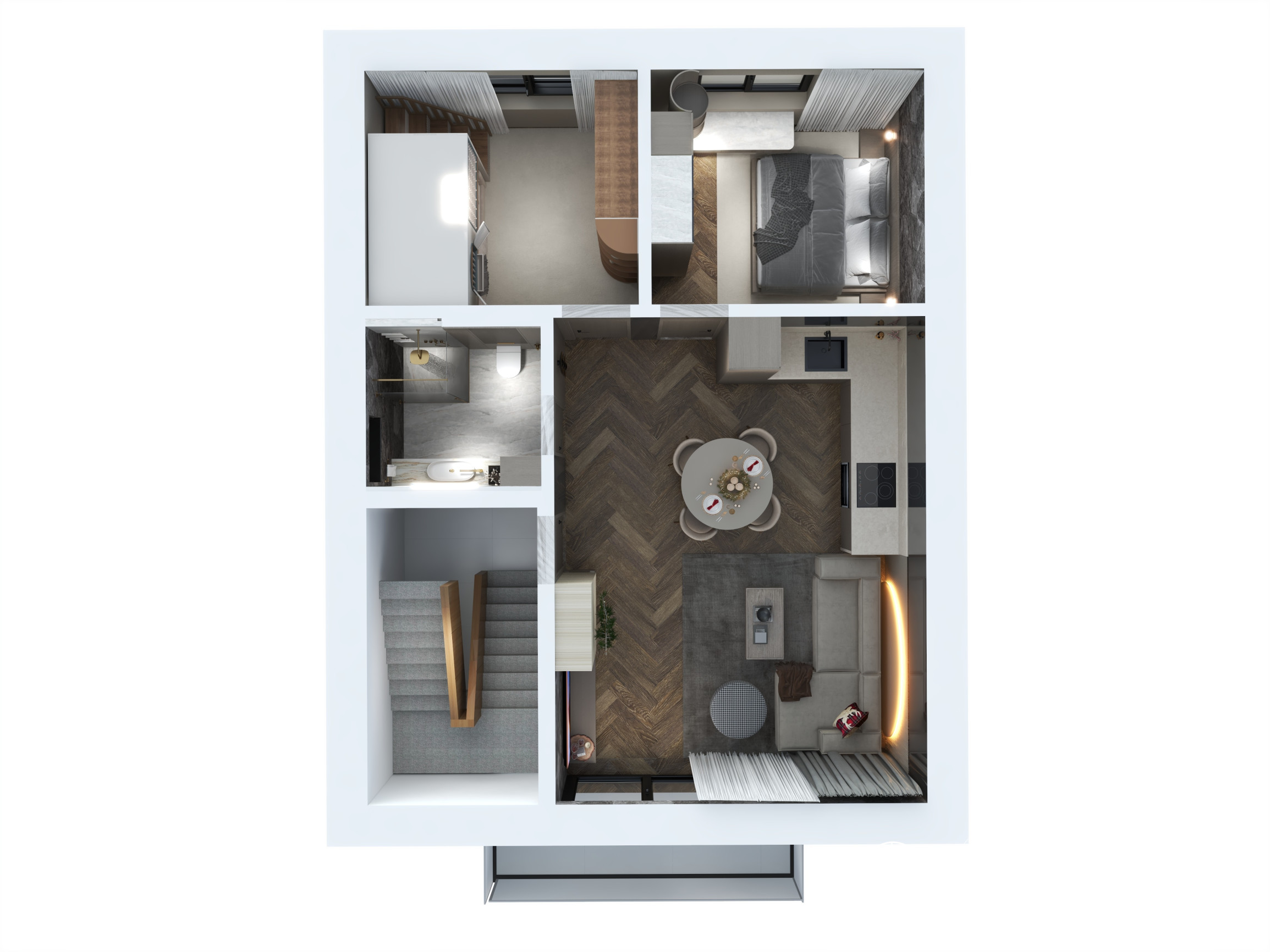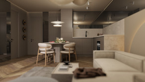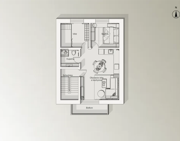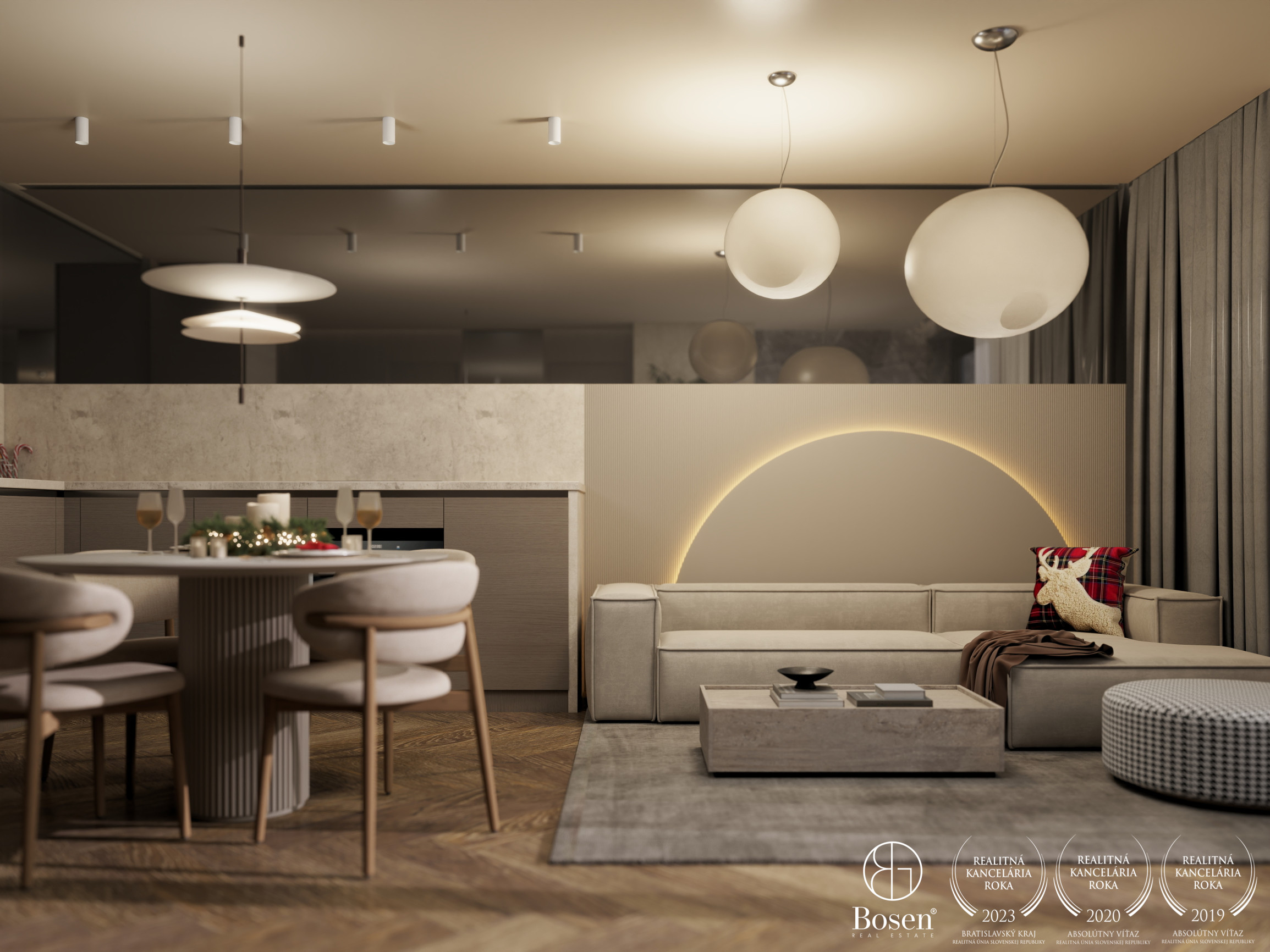 DISPOZÍCIA: Apartmán má praktickú a vzdušnú dispozíciu: vstupná chodba so schodiskom, kúpeľňa s toaletou, priestranná obývacia izba prepojená s kuchyňou a jedálenskou časťou s výstupom na terasu, spálňa a samostatná izba (detská izba).