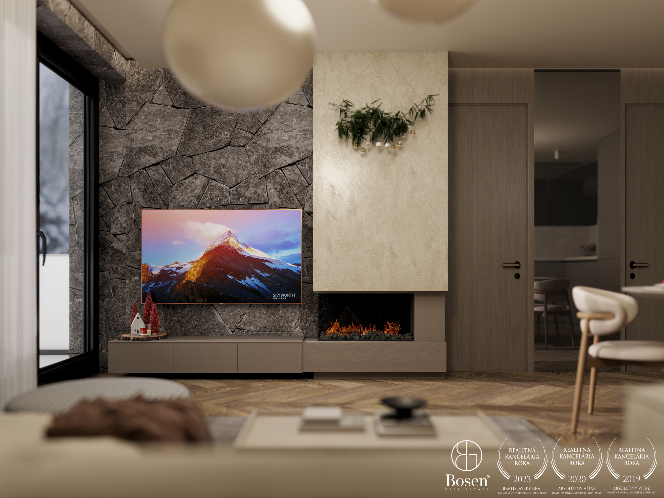 APARTMÁN: Celková výmera podlahovej plochy apartmánu je 53,63 m² a prislúcha k nemu balkón/terasa o výmere 7 m². Nachádza sa na 1. nadzemnom podlaží. Veľkým benefitom je príprava na krb, ktorý dotvára pravú horskú atmosféru v obývacej časti.