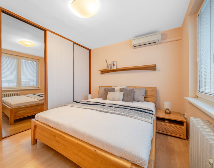 BYT: Celková výmera bytu je 77 m² a nachádza sa na 7. poschodí zo 7 v bytovom dome s výťahom. K bytu prislúcha pivnica. Byt je vybavený dvoma klimatizačnými jednotkami.