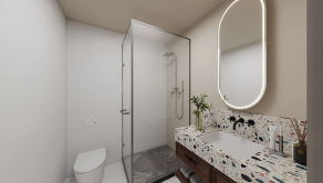 4. izbový byt v rodinnom dome disponuje troma (3) spálňami, dvoma (2) kúpeľňami, samostatnou technickou miestnosťou, zádverím, samostatnou toaletou a priestrannou obývačkou s kuchyňou a komorou (špajzou).