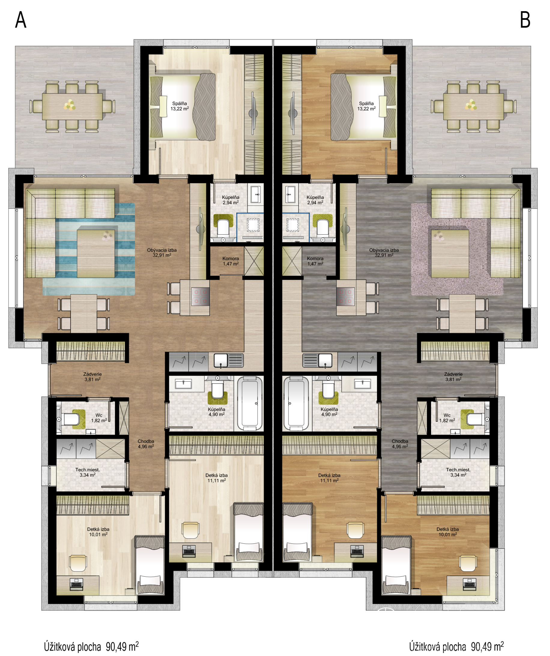 Dispozičné riešenie domu zádverie (3,81 m2), obývacia izba s kuchyňou (32,91 m2), komora (1,47 m2), spálňa s kúpeľňou a WC (13,22 m2 + 2,94 m2), chodba (4,96 m2), izba1 (11,11 m2), izba2 (10,01 m2), kúpeľňa (4,90 m2), technická miestnosť (3,34 m2), hosťovské WC (1,82 m2), terasa (12 m2).