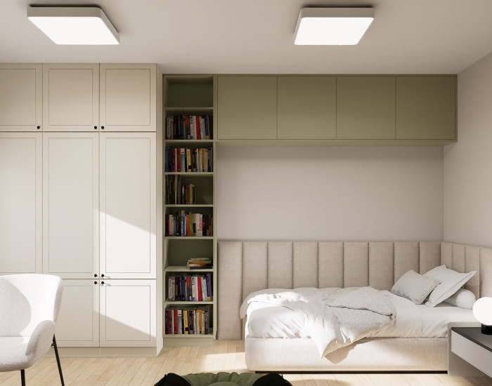Nočná časť pozostáva z troch samostatných izieb s výmerami 15,3 m², 12,6 m² a 11,5 m². Dom disponuje jednou kúpeľňou s WC (6,5 m²) a zároveň samostatným WC (1,6 m²). Komfort bývania dopĺňajú špajza 0,7 m², technická miestnosť 1,9 m², sklad 2,0 m², zádverie 5,0 m² a chodby 6,3 m² a 2,6 m².