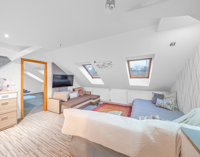 POSCHODIE: Štvorizbový byt: Vstupná časť: Po schodoch vyjdete k hlavným vstupným dverám, za ktorými nasleduje chodba a ďalšie interiérové schodisko vedúce do srdca bytu.Nočná časť (pravá strana): Tu sa nachádzajú dve izby, ktoré sú riešené ako priechodné – ideálne ako priestranná spálňa so šatníkom alebo detská izba s herňou.Otvorený koncept: Dominantou bytu je priestranná obývacia izba moderne prepojená s kuchyňou, čo vytvára vzdušný a presvetlený priestor pre rodinný životKúpeľňa: Samostatná kúpeľňa so sprchovým kútom umiestnená v rámci dispozície.Štvrtá izba: Na opačnej strane bytu sa nachádza ďalšia samostatná izba, ktorá môže slúžiť ako hosťovská izba alebo tichá pracovňa Byt je vykurovaný samostatným centrálnym plynovým kotlom, čo umožňuje novému majiteľovi mať náklady na bývanie plne pod kontrolou a nezávisle od nebytových priestorov na prízemí.