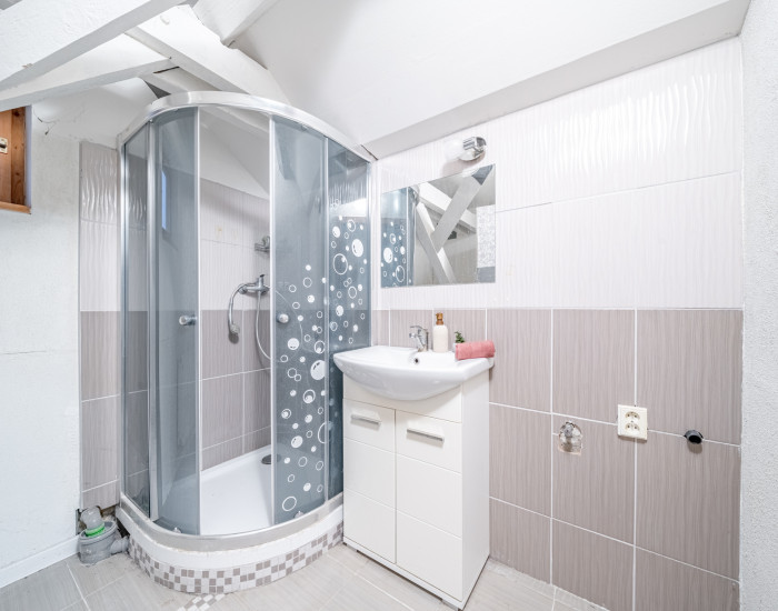 POSCHODIE: Štvorizbový byt: Vstupná časť: Po schodoch vyjdete k hlavným vstupným dverám, za ktorými nasleduje chodba a ďalšie interiérové schodisko vedúce do srdca bytu.Nočná časť (pravá strana): Tu sa nachádzajú dve izby, ktoré sú riešené ako priechodné – ideálne ako priestranná spálňa so šatníkom alebo detská izba s herňou.Otvorený koncept: Dominantou bytu je priestranná obývacia izba moderne prepojená s kuchyňou, čo vytvára vzdušný a presvetlený priestor pre rodinný životKúpeľňa: Samostatná kúpeľňa so sprchovým kútom umiestnená v rámci dispozície.Štvrtá izba: Na opačnej strane bytu sa nachádza ďalšia samostatná izba, ktorá môže slúžiť ako hosťovská izba alebo tichá pracovňa Byt je vykurovaný samostatným centrálnym plynovým kotlom, čo umožňuje novému majiteľovi mať náklady na bývanie plne pod kontrolou a nezávisle od nebytových priestorov na prízemí.