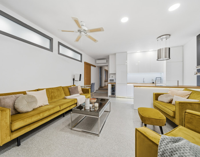 ZARIADENIE: Byt sa predáva kompletne zariadený a ponúka dostatok úložného priestoru vďaka vstavaným skriniam na mieru. Po celej dĺžke chodby sa nachádza hlboká vstavaná skriňa. V chodbe je tiež samostatný sklad na odkladanie technických vecí, gauč a zrkadlo. Kuchyňa je vybavená vstavanou kuchynskou linkou na mieru so vstavanými spotrebičmi: umývačka riadu, digestor, indukčná varná doska, elektrická rúra a chladnička s mrazničkou. Obývacia časť disponuje žltým gaučom, konferenčnými stolíkmi, kreslami, TV a TV zostavou. V jedálenskej časti sa nachádza veľký jedálenský stôl so šiestimi stoličkami. Z jedálne je výstup na spoločnú terasu. Obidve spálne sú vybavené manželskou posteľou s matracom, vstavanou skriňou a komodami.