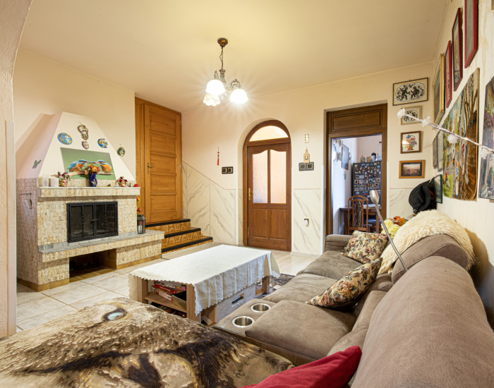Prízemie pozostáva zo vstupnej predsiene, samostatného WC, kuchyne, priestrannej obývacej izby s krbom na drevo a priamym východom na krytú terasu, jednej izby a garáže.