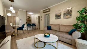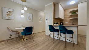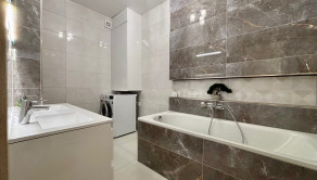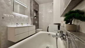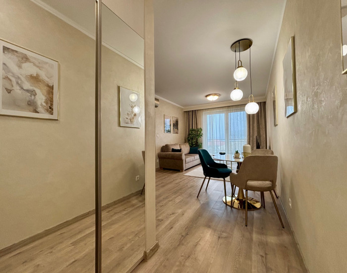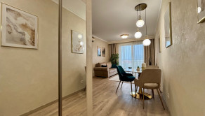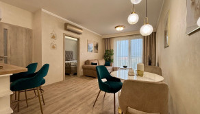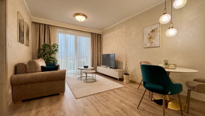 ZARIADENIE: Byt sa prenajíma kompletne zariadený moderným nábytkom, pripravený na okamžité nasťahovanie. V chodbe sa nachádza vstavaná skriňa s vešiakom. Kuchyňa je vybavená kuchynskou linkou s umývačkou riadu, elektrickou rúrou, indukčnou varnou doskou, chladničkou s mrazničkou a barovým sedením a jedálenským stolom so stoličkami. Obývacia izba ponúka pohodlnú pohovku, konferenčný stolík, televízor so stolíkom. Kúpeľňa je vybavená vaňou, toaletou a práčkou. Spálňa disponuje manželskou posteľou s matracmi a vstavanou roll-door skriňou.
