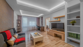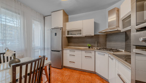 ZARIADENIE: Byt sa prenajíma zariadený. V obývačke sa nachádza sedačka, vstavaná skriňa, skrinka pod TV aj s TV, policová skriňa a konferenčný stolík, a pracovný kútik. Kuchyňa disponuje kuchynským kútom s elektrospotrebičmi (plynová varná doska, rúra, mikrovlnná rúra, umývačka riadu, chladnička s mrazničkou, digestor), jedálenský stôl s 3 stoličkami a vstup na priestrannú loggiu. V spálni sa nachádzajú posteľ a komodové skrine ktoré poskytujú dostatok úložného priestoru. V detskej izbe sa nachádza 2x posteľ a vstavaná skriňa, nad dverami je namontovaná hrazda na cvičenie. V chodbe ktorá spája vstupné dvere a ostatné izby sa nachádza vstavaná skriňa a botník. Kúpeľňa a WC sú dostupné z chodby.
