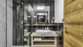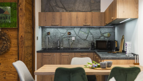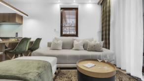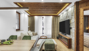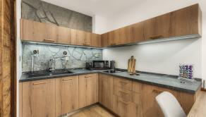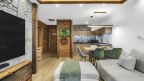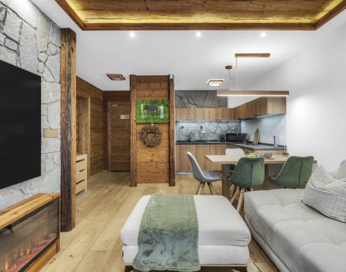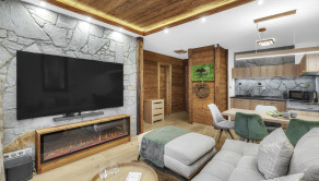 APARTMÁN: Jedná sa o dvojizbový apartmán s obytnou plochou 38 m2 a terasa o výmere 15 m2. Apartmán je vybavený plne elektronickým a monitorovateľným vstupom. Interiér apartmánu je zariadený do vysokého štandardu vrátane vybavenia ako : LED stropné osvetlenie, žulový kameň, importované drevené obklady, dánske a nemecké LED doplnky. Vykurovanie je riešené formou radiátorov, okná plastové s izolačným trojsklom, v apartmáne je vysokorýchlostné internetové a TV pripojenie. Terasa apartmánu je vybavená infračerveným výhrevným systémom a monitorovaním na diaľku cez aplikáciu a nechýba elektrické pripojenie a osvetlenie a bambusové sedenie. Apartmán prešiel v roku 2021 kompletnou rekonštrukciou.