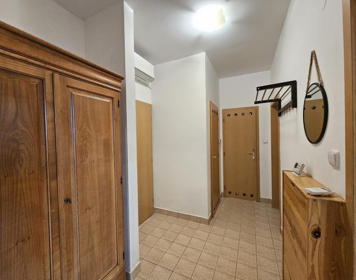 Vstup do bytu je cez predsieň. Napravo sa nachádza obývacia izba prepojená s kuchyňou, naľavo samostatná spálňa. Byt disponuje samostatným WC a kúpeľňou s vaňou.