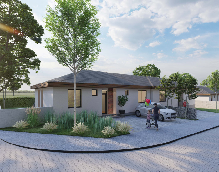 RODINNÝ DOM: v ponuke je 6 prízemných 4 izbových rodinných domov. Domy budú postavené do štádia "štandard"- vymaľované steny, osadené vypínače, zásuvky, interiérové dvere a zárubne, obklady a sanita v kúpeľniach vrátane dokončeného exteriéru - oplotenie, brána a vybudované parkovacie miesta pred domom. Farebné prevedenie štandardu je voliteľné. V cene je predpríprava na vonkajšie elektrické žalúzie, klimatizácia, alarm a fotovoltiku. Vykurovanie bude zabezpečené tepelným čerpadlom. Domy budú napojené na elektrinu, vodu, kanalizáciu a optickú sieť. Projekt je v štádiu prípravy výstavby-je vydané stavebné povolenie. Predpokladaný termín zahájenia výstavby rodinných domov je jarné obdobie 2026 a predpokladaný termín dokončenia je v roku 2027.
