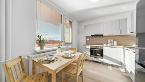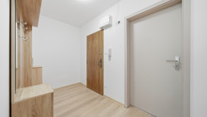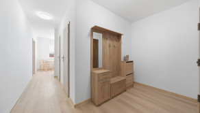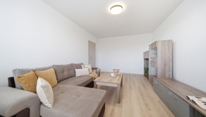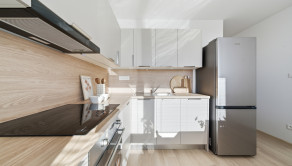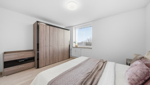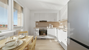 ZARIADENIE: Byt sa prenajíma kompletne zariadený novým nábytkom. Vo vstupnej chodbe sa nachádza predsieňová zostava (skrinka na topánky, zrkadlo, vešiak a komoda). Obývacia izba je vybavená pohodlnou rozťahovacou sedačkou, konferenčným stolíkom a skrinkovou zostavou pod TV. Kuchyňa disponuje novou kuchynskou linkou so vstavanými spotrebičmi, ako sú umývačka riadu, elektrická rúra, elektrická varná doska a digestor, pričom chladnička s mrazničkou je samostatne stojaca. Súčasťou kuchyne je aj jedálenský stôl so štyrmi stoličkami a priamy vstup na loggiu, ktorá je vybavená sieťkou proti hniezdeniu vtáctva. Spálňa ponúka manželskú posteľ, nočné stolíky a úložný priestor. Druhá izba je ponechaná nezariadená, čo dáva budúcemu nájomcovi možnosť zariadiť si ju podľa vlastných predstáv. V kúpeľni sa nachádza sprchový kút, práčka, umývadlo, skrinka pod umývadlom, zrkadlová skrinka a ďalší úložný priestor. Súčasťou prenájmu je aj komora nachádzajúca sa na tej istej chodbe ako byt, ako aj pivnica umiestnená v spoločných priestoroch na prízemí bytového domu.