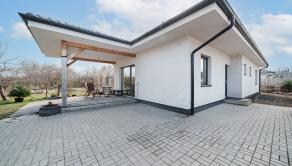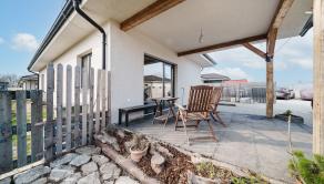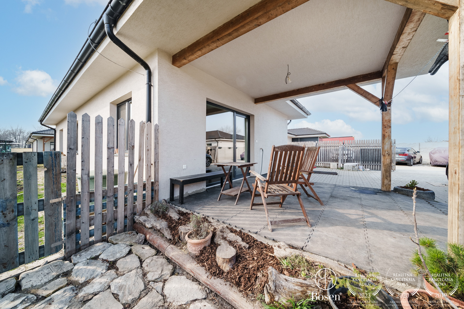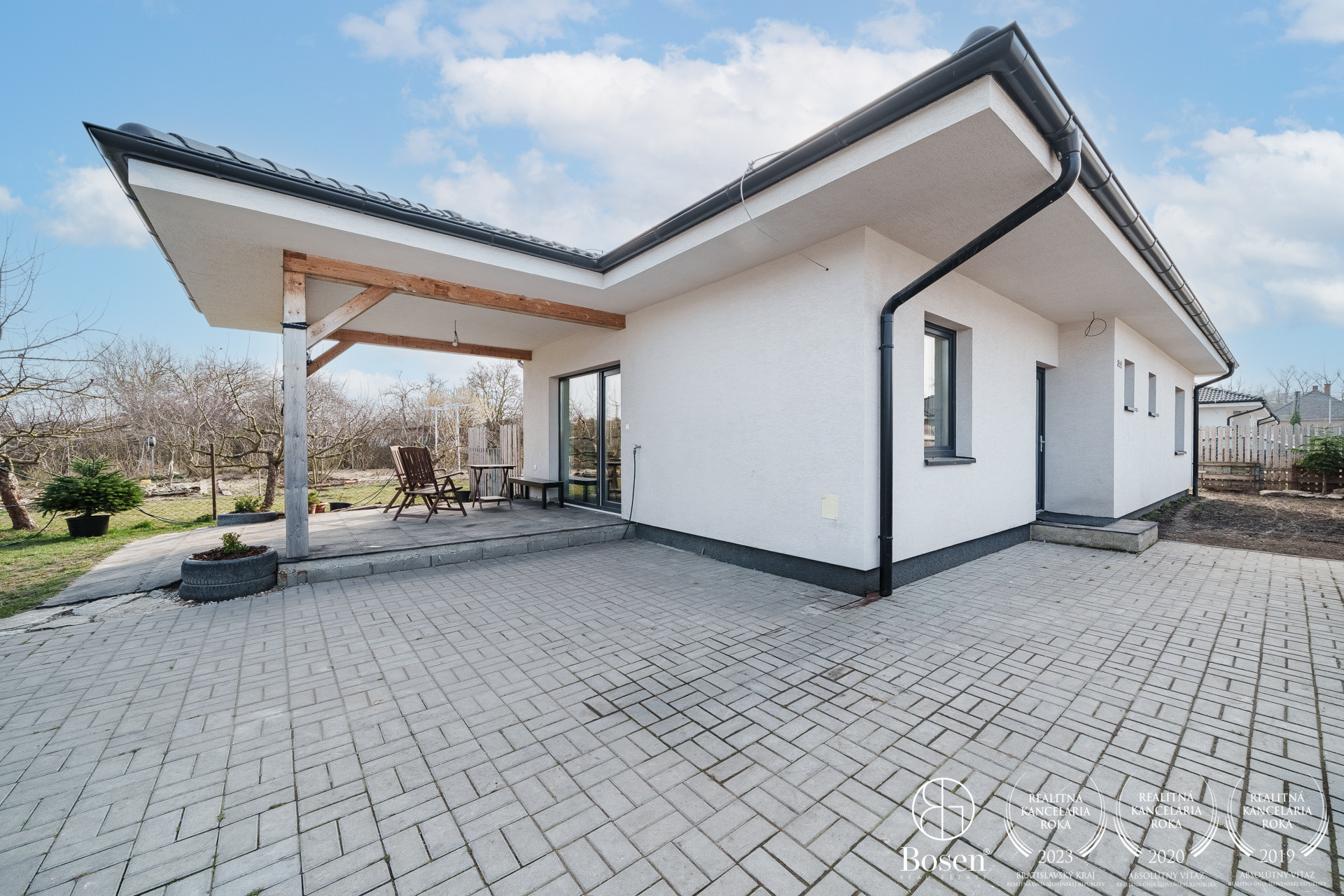 DOM: Samostatne stojaci prízemný 4 – izbový bungalov (119m2) je 4-ročná novostavba s podlahovým kúrením, Dom je napojený na obecný vodovod a odpad je riešený žumpou. Moderné prevedenie, kvalitné materiály a praktické riešenia zaručujú príjemné a bezstarostné bývanie. Dom je v slepej uličke a poskytuje súkromie a oddych pre budúceho nájomcu. Orientácia domu JV.
