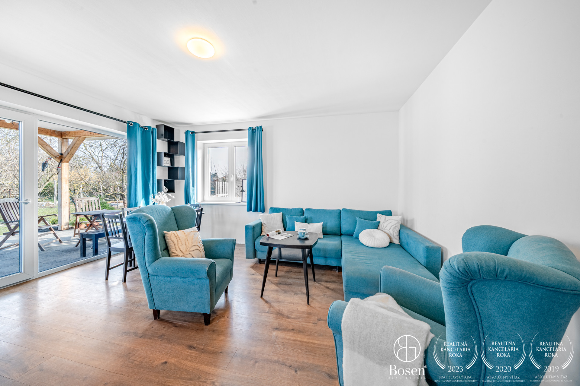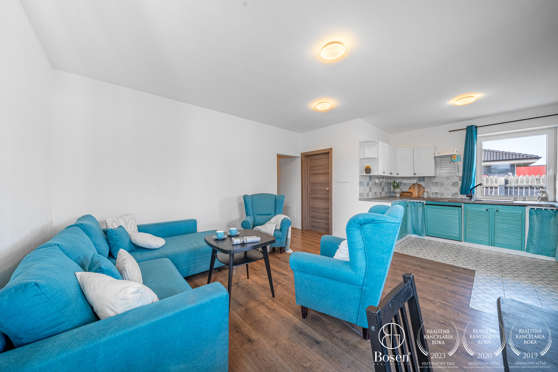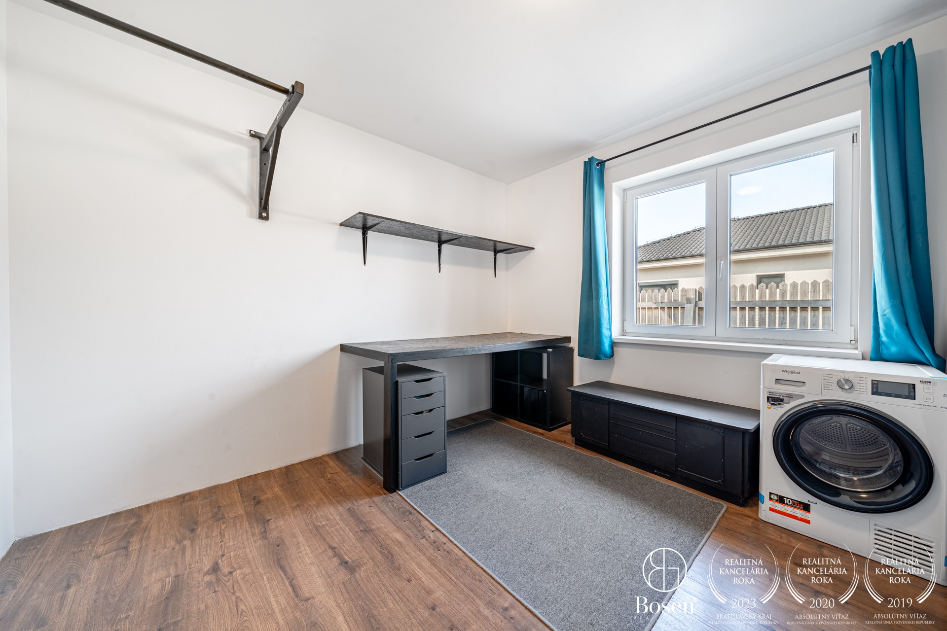 DISPOZÍCIA A ZARIADENIE: Dom ponúka štyri komfortné izby – obývačku prepojenú s kuchyňou, spálňu, detskú izbu a pracovňu. Kuchyňa je vyrobená na mieru a vybavená spotrebičmi (indukčná doska, rúra, umývačka riadu, chladnička s mrazničkou). V obývacej časti sa nachádza jedálenský stôl, sedacia súprava, kreslá a konferenčný stolík. Kúpeľňa disponuje sprchovým kútom, vaňou, toaletou, práčkou a sušičkou, pri vstupe je samostatné WC. Dom je pripojený na internet Slovanet 200 Mb/s, ideálny aj na prácu z domu. Lokalita poskytuje pokojné rodinné bývanie s rýchlou dostupnosťou do Šamorína, Dunajskej Stredy a Bratislavy.