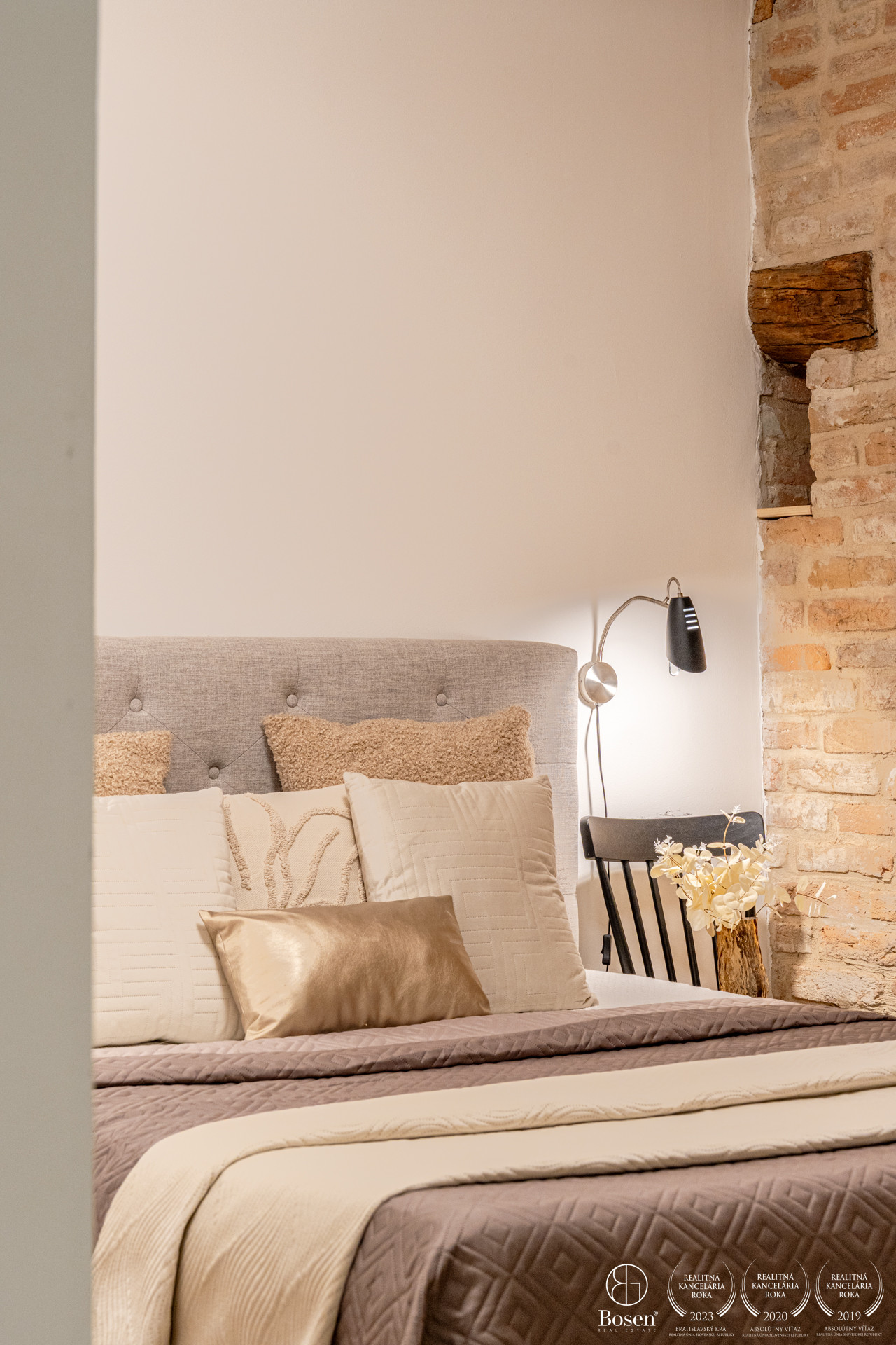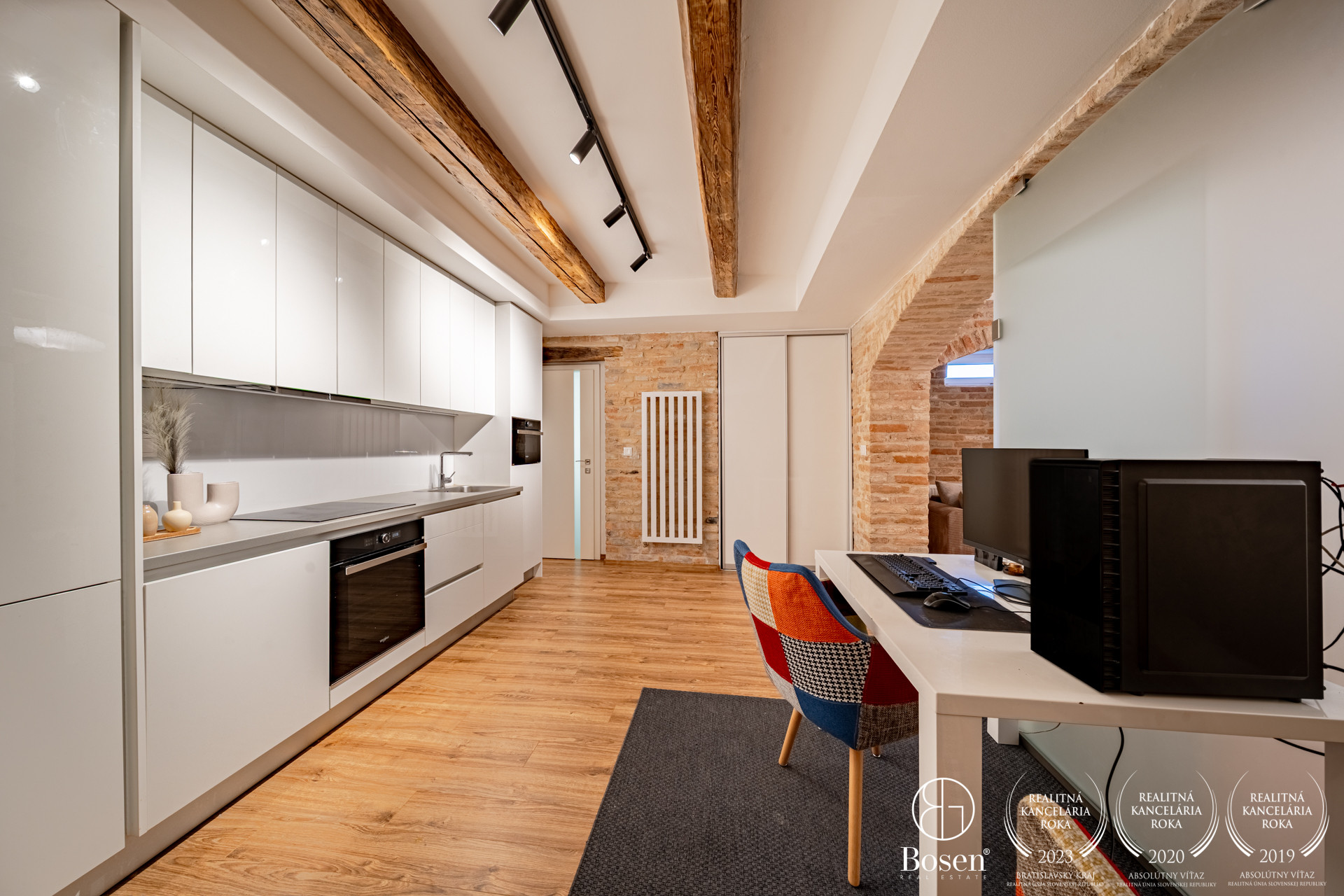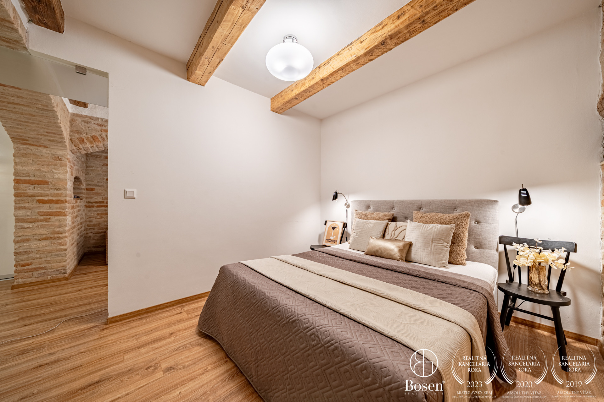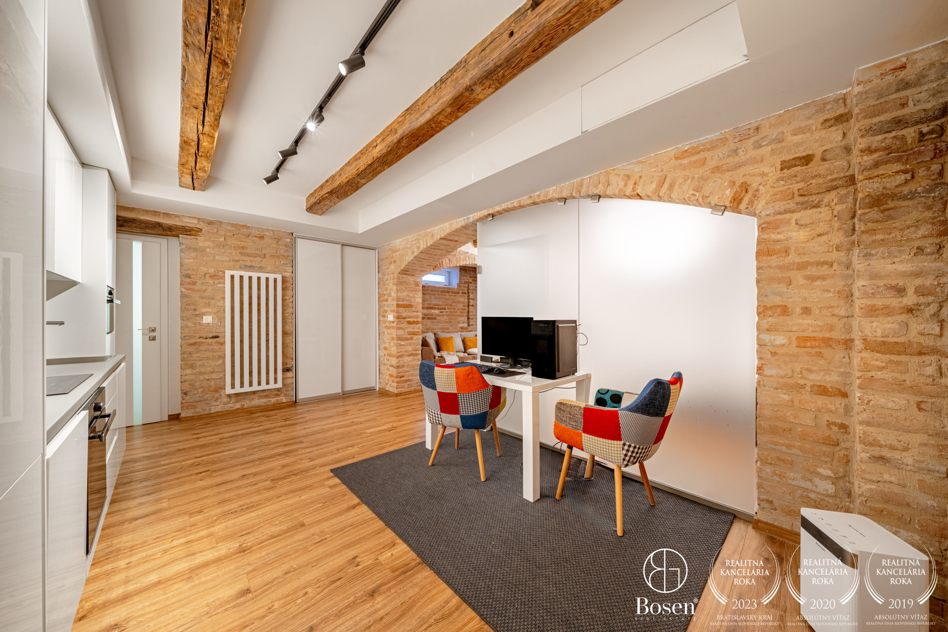BYT: Má podlahovú plochu 52 m2 a prenajíma sa kompletne zariadený a vybavený. Má príjemnú atmosféru vďaka veľkým klenbám, trámom na stropoch a dobre usporiadanej dispozícii.