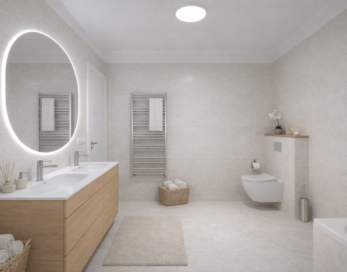 Interiér – holodom - obvodové steny a priečky, dokončené všetky rozvody elektriky, vody, odpadu, tepelné čerpadlo, podlahové kúrenie, omietky, biela maľovka, predpríprava na exteriérové žaluzie.