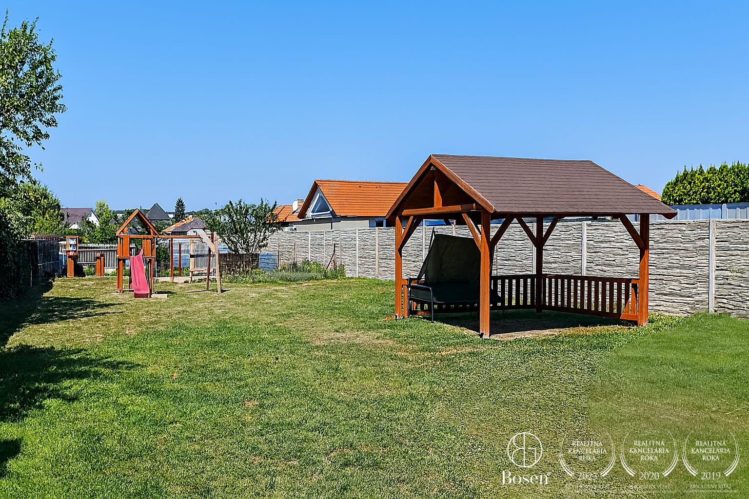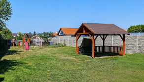 Pozemok s výmerou 1291 m² ponúka veľkorysý priestor na oddych aj záhradníčenie. Nachádza sa tu altánok 6 × 4 m, šmykľavka s pieskoviskom, hojdačky a záhradné osvetlenie. Parkovanie je možné pred domom aj priamo na pozemku.
