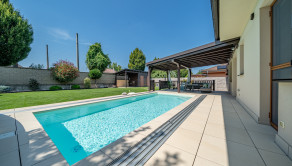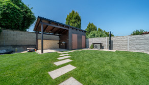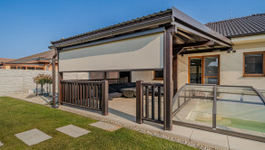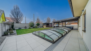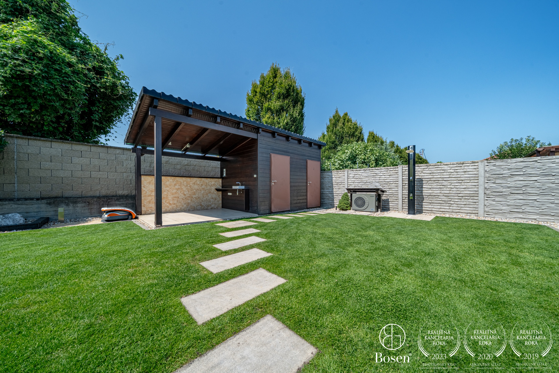 Rozloha pozemku je 600 m² a ide o rovný, obdĺžnikový pozemok, ktorý poskytuje priestranný a komfortný priestor. Oplotenie zadnej časti pozemku a bočných strán tvorí betónový plot, predná časť pozemku je oplotená kovovým plotom s bráničkou a posúvnou bránou vedúcou do dvojgaráže. Pred garážou sa nachádza státie pre 2 vozidlá. Okolie domu je vybavené chodníkom vedúcim na terasu, kde sa nachádza bazén s priezračnou sladkou vodou a prekrytá terasa so zatienenou roletou Zipscreen na diaľkové ovládanie.